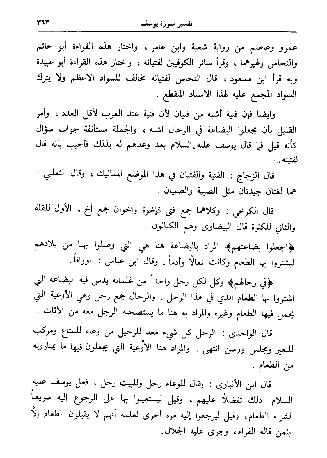عمرو وعاصم من رواية شعبة وابن عامر، واختار هذه القراءة أبو حاتم والنحاس وغيرهما، وقرأ سائر الكوفيين لفتيانه، واختار هذه القراءة أبو عبيدة وبه قرأ ابن مسعود، قال النحاس لفتيانه مخالف للسواد الأعظم ولا يترك السواد المجمع عليه لهذا الإسناد المنقطع.