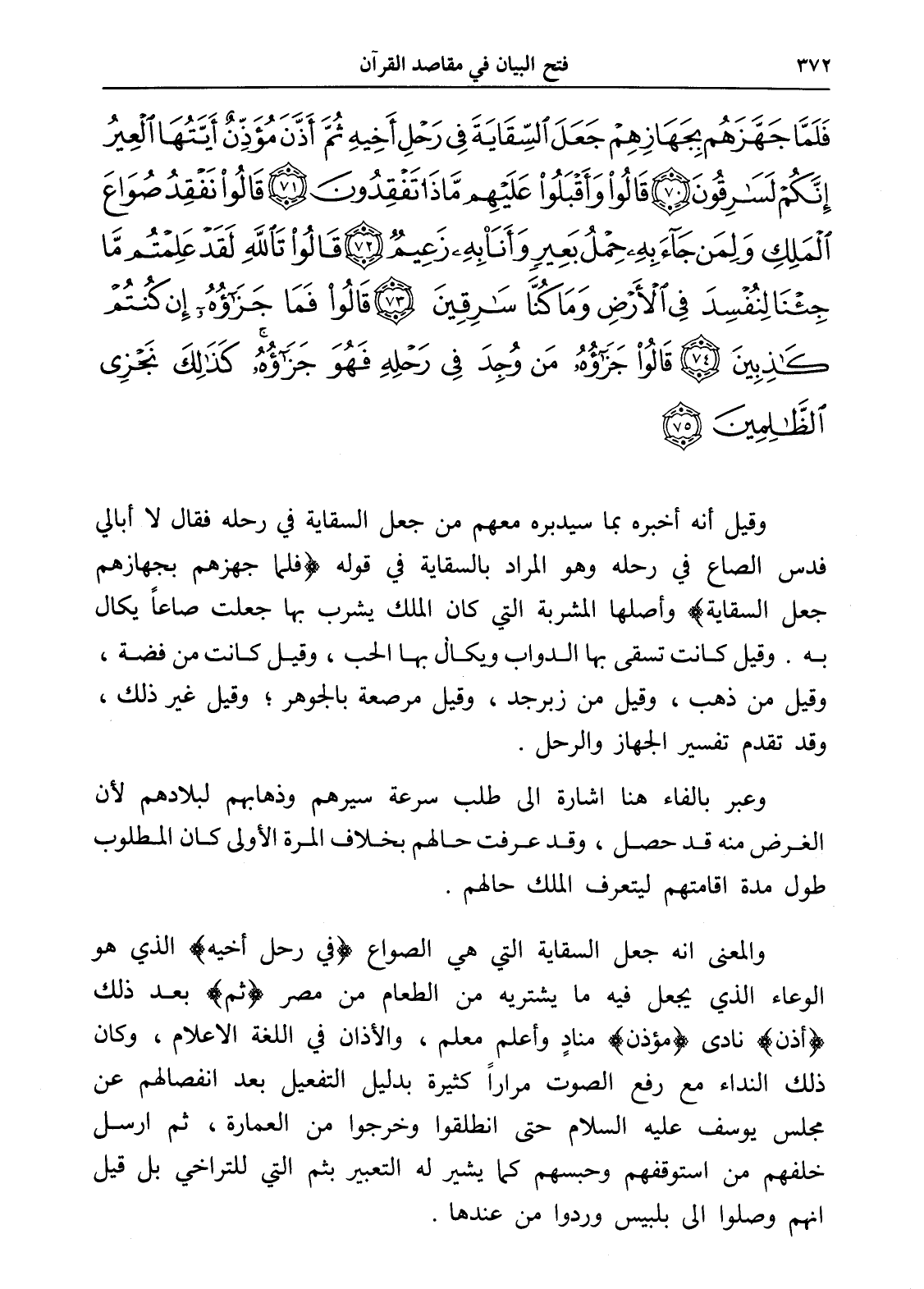 فَلَمَّا جَهَّزَهُمْ بِجَهَازِهِمْ جَعَلَ السِّقَايَةَ فِي رَحْلِ أَخِيهِ ثُمَّ أَذَّنَ مُؤَذِّنٌ أَيَّتُهَا الْعِيرُ إِنَّكُمْ لَسَارِقُونَ (70) قَالُوا وَأَقْبَلُوا عَلَيْهِمْ مَاذَا تَفْقِدُونَ (71) قَالُوا نَفْقِدُ صُوَاعَ الْمَلِكِ وَلِمَنْ جَاءَ بِهِ حِمْلُ بَعِيرٍ وَأَنَا بِهِ زَعِيمٌ (72) قَالُوا تَاللَّهِ لَقَدْ عَلِمْتُمْ مَا جِئْنَا لِنُفْسِدَ فِي الْأَرْضِ وَمَا كُنَّا سَارِقِينَ (73) قَالُوا فَمَا جَزَاؤُهُ إِنْ كُنْتُمْ كَاذِبِينَ (74) قَالُوا جَزَاؤُهُ مَنْ وُجِدَ فِي رَحْلِهِ فَهُوَ جَزَاؤُهُ كَذَلِكَ نَجْزِي الظَّالِمِينَ (75)