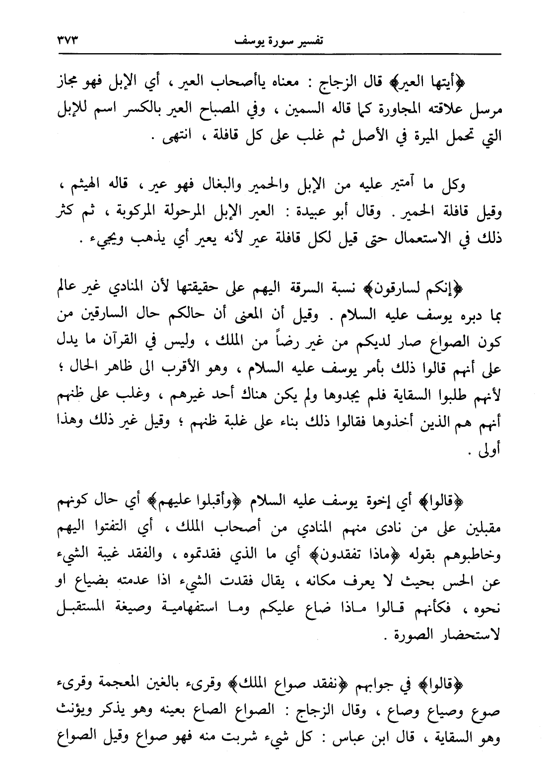 (إنكم لسارقون) نسبة السرقة إليهم على حقيقتها لأن المنادي غير عالم بما دبره يوسف عليه السلام. وقيل أن المعنى أن حالكم حال السارقين من كون الصواع صار لديكم من غير رضاً من الملك، وليس في القرآن ما يدل على أنهم قالوا ذلك بأمر يوسف عليه السلام، وهو الأقرب إلى ظاهر الحال؛ لأنهم طلبوا السقاية فلم يجدوها ولم يكن هناك أحد غيرهم، وغلب على ظنهم أنهم هم الذين أخذوها فقالوا ذلك بناء على غلبة ظنهم؛ وقيل غير ذلك وهذا أولى.