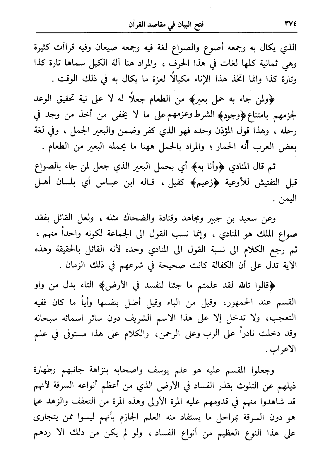 ثم قال المنادي (وأنا به) أىِ بحمل البعير الذي جعل لمن جاء بالصواع قبل التفتيش للأوعية (زعيم) كفيل، قاله ابن عباس أي بلسان أهل اليمن.