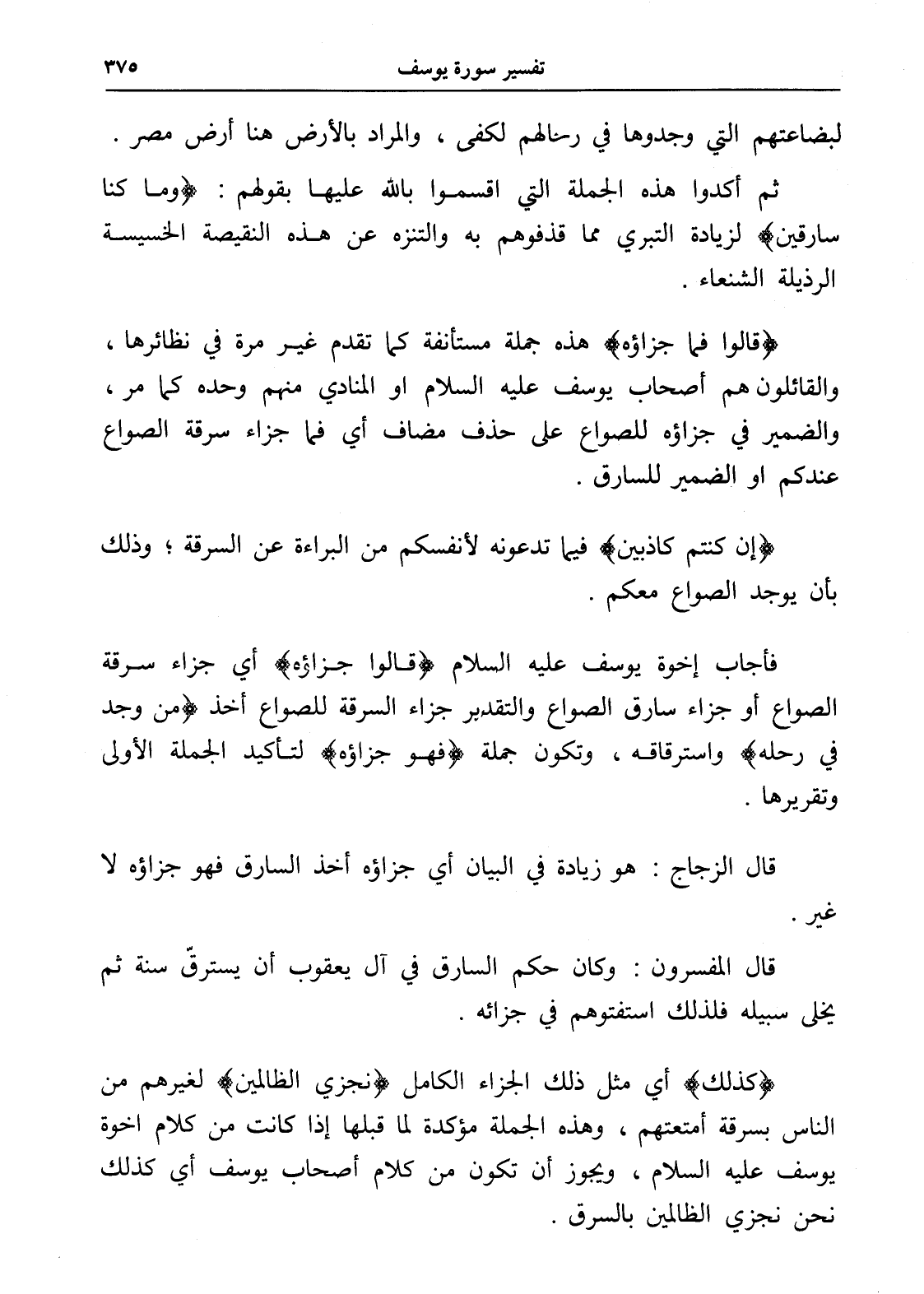 (كذلك) أي مثل ذلك الجزاء الكامل (نجزي الظالمين) لغيرهم من الناس بسرقة أمتعتهم، وهذه الجملة مؤكدة لما قبلها إذا كانت من كلام إخوة يوسف عليه السلام، ويجوز أن تكون من كلام أصحاب يوسف أي كذلك نحن نجزي الظالمين بالسرق.