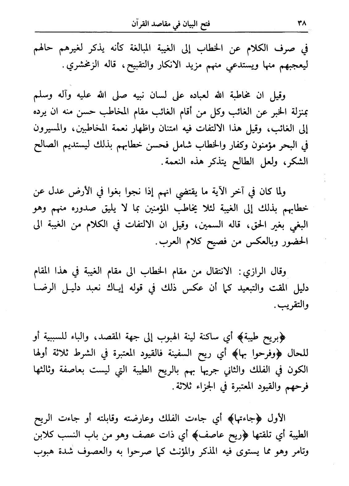 وقيل أن مخاطبة الله لعباده على لسان نبيه صلى الله عليه وآله وسلم بمنزلة الخبر عن الغائب وكل من أقام الغائب مقام المخاطب حسن منه أن يرده إلى الغائب، وقيل هذا الالتفات فيه امتنان وإظهار نعمة المخاطبين، والمسيرون في البحر مؤمنون وكفار والخطاب شامل فحسن خطابهم بذلك ليستديم الصالح الشكر، ولعل الطالح يتذكر هذه النعمة.