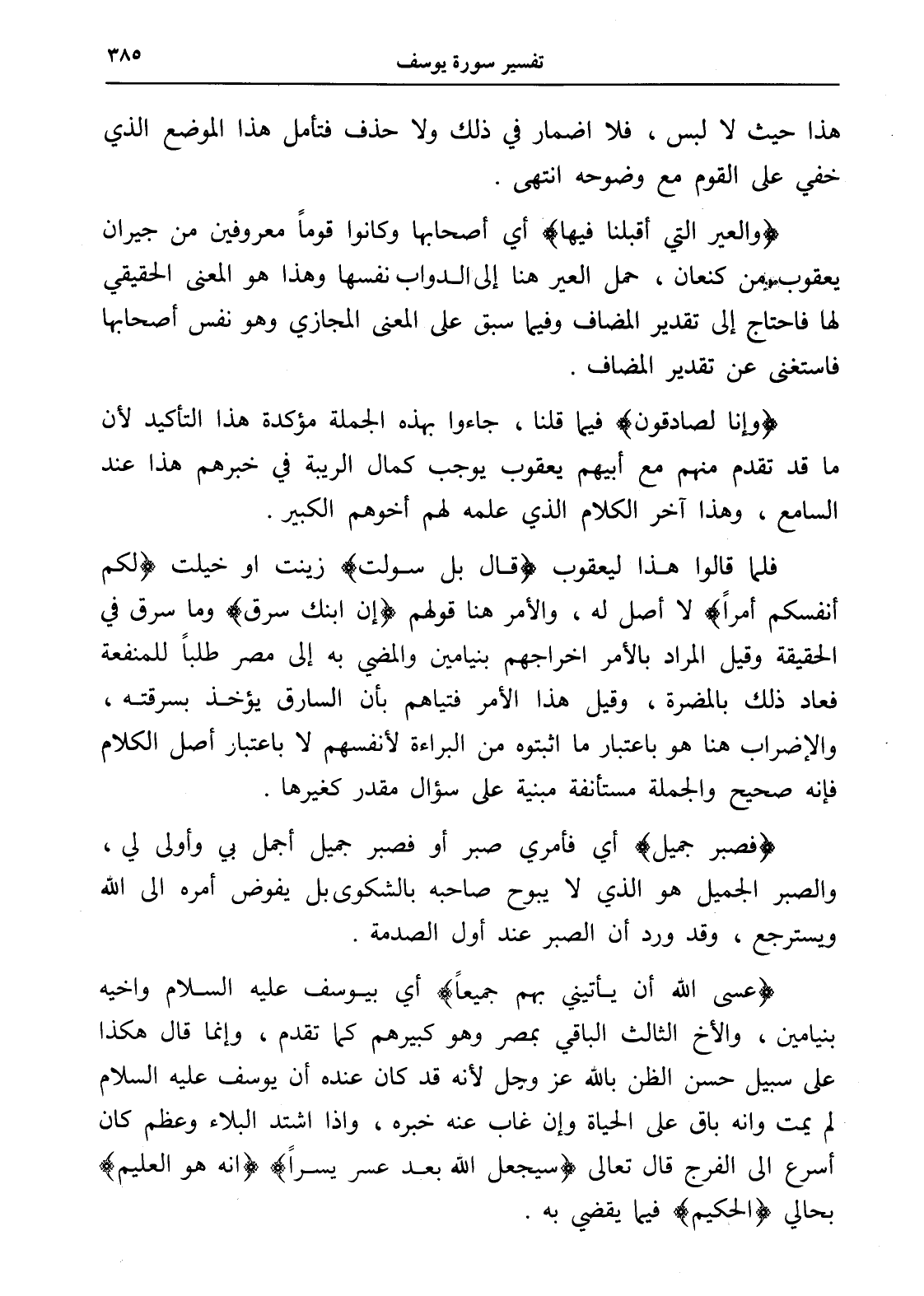 (فصبر جميل) أي فأمري صبر أو فصبر جميل أجمل بي وأولى لي، والصبر الجميل هو الذي لا يبوح صاحبه بالشكوى بل يفوض أمره إلى الله ويسترجع، وقد ورد أن الصبر عند أول الصدمة.