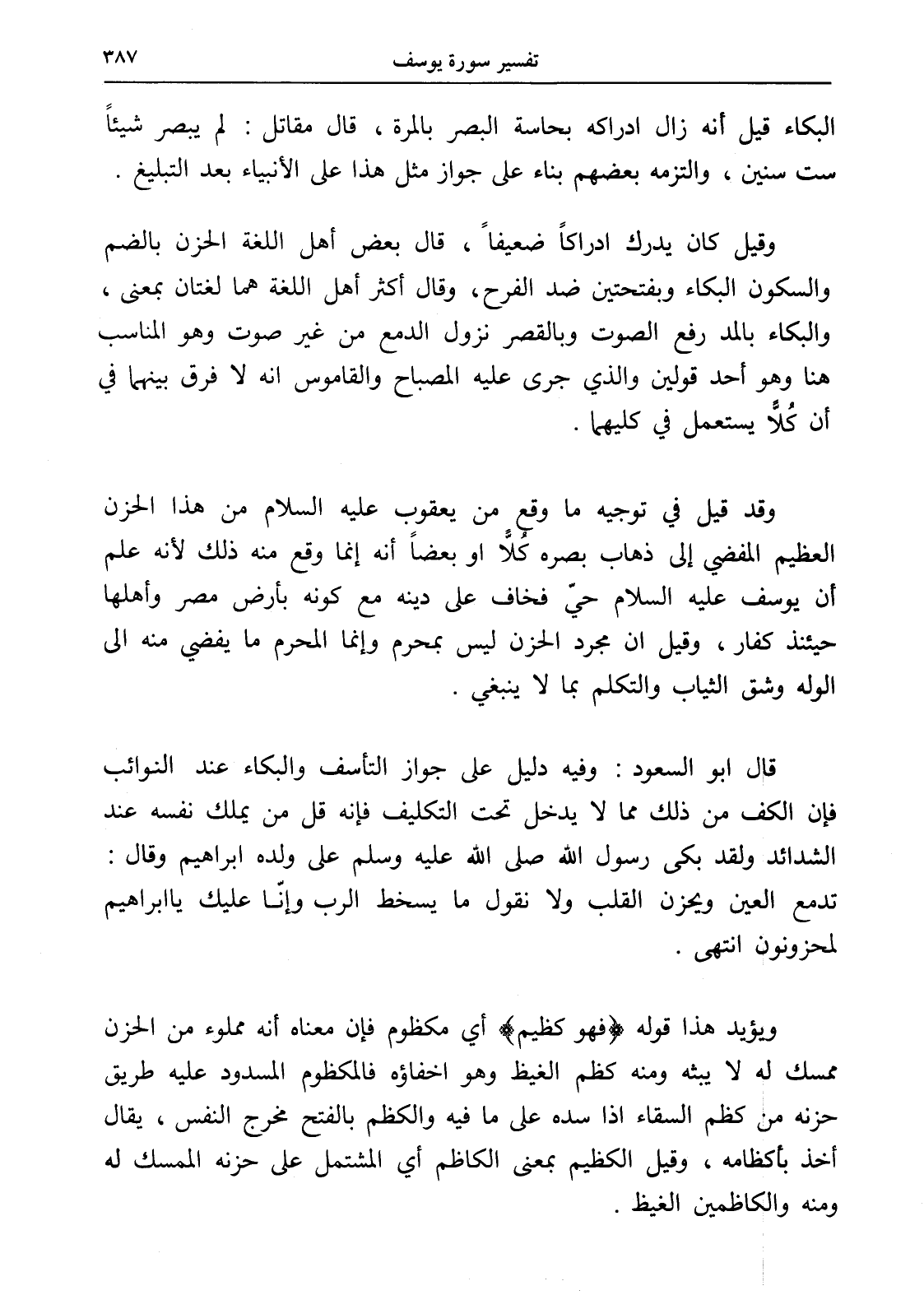 وقد قيل في توجيه ما وقع من يعقوب عليه السلام من هذا الحزن العظيم المفضي إلى ذهاب بصره كُلاًّ أو بعضاً أنه إنما وقع منه ذلك لأنه علم أن يوسف عليه السلام حيّ فخاف على دينه مع كونه بأرض مصر وأهلها حيئنذ كفار، وقيل أن مجرد الحزن ليس بمحرم وإنما المحرم ما يفضي منه إلى الوله وشق الثياب والتكلم بما لا ينبغي.
