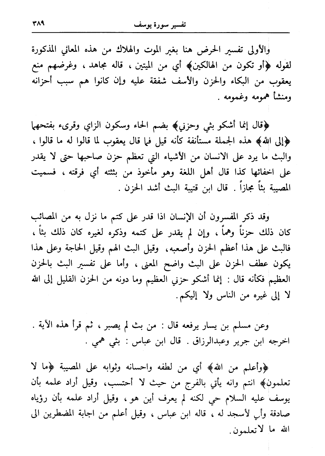 وعن مسلم بن يسار يرفعه قال: من بث لم يصبر، ثم قرأ هذه الآية. أخرجه ابن جرير وعبد الرزاق. قال ابن عباس: بثي همي.