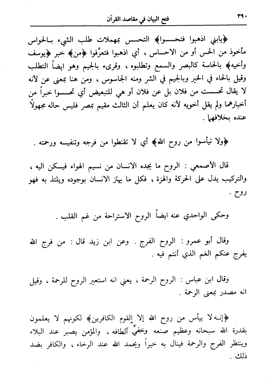 وقال أبو عمرو: الروح الفرج. وعن ابن زيد قال: من فرج الله يفرج عنكم الغم الذي أنتم فيه.