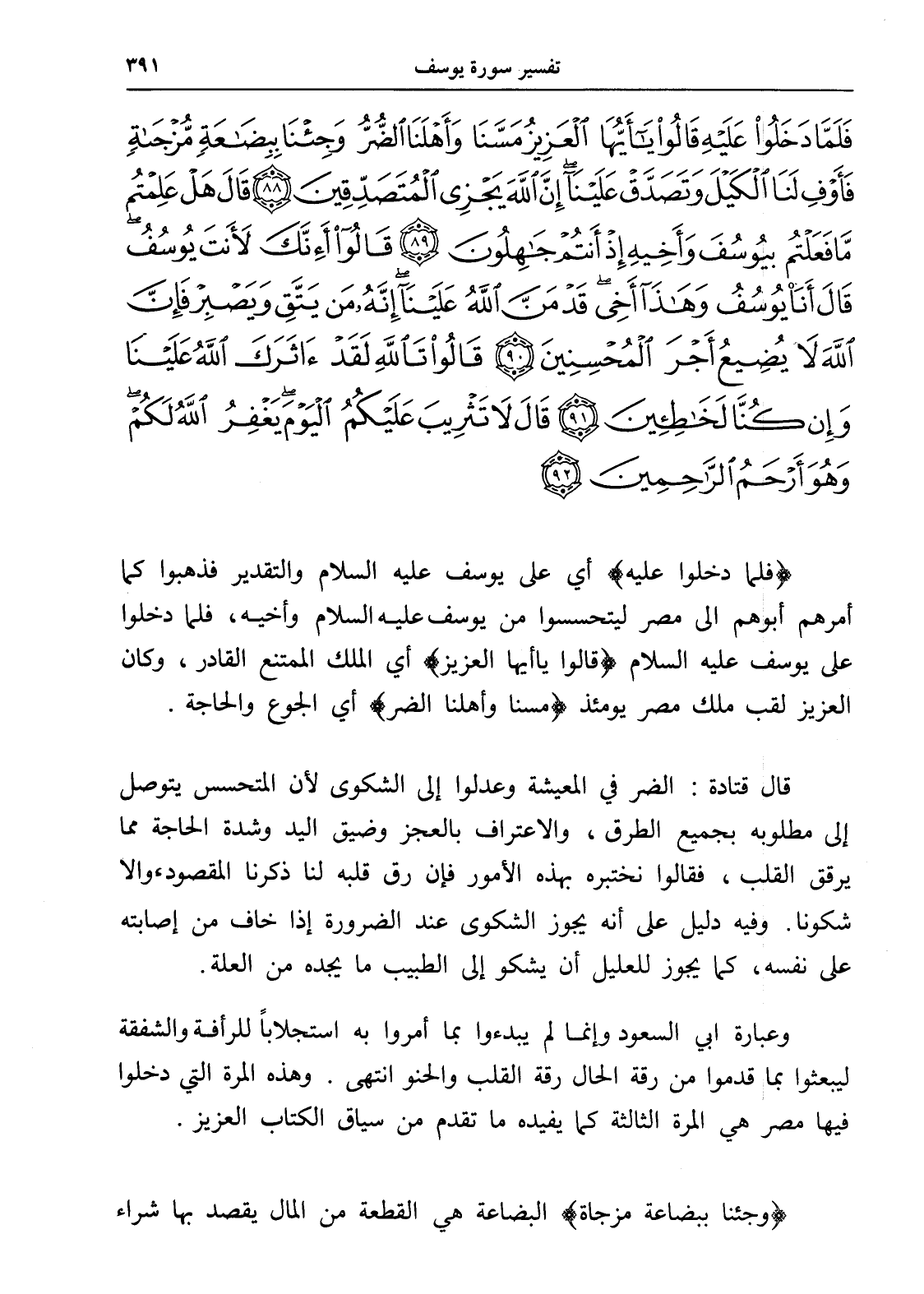 فَلَمَّا دَخَلُوا عَلَيْهِ قَالُوا يَا أَيُّهَا الْعَزِيزُ مَسَّنَا وَأَهْلَنَا الضُّرُّ وَجِئْنَا بِبِضَاعَةٍ مُزْجَاةٍ فَأَوْفِ لَنَا الْكَيْلَ وَتَصَدَّقْ عَلَيْنَا إِنَّ اللَّهَ يَجْزِي الْمُتَصَدِّقِينَ (88) قَالَ هَلْ عَلِمْتُمْ مَا فَعَلْتُمْ بِيُوسُفَ وَأَخِيهِ إِذْ أَنْتُمْ جَاهِلُونَ (89) قَالُوا أَإِنَّكَ لَأَنْتَ يُوسُفُ قَالَ أَنَا يُوسُفُ وَهَذَا أَخِي قَدْ مَنَّ اللَّهُ عَلَيْنَا إِنَّهُ مَنْ يَتَّقِ وَيَصْبِرْ فَإِنَّ اللَّهَ لَا يُضِيعُ أَجْرَ الْمُحْسِنِينَ (90) قَالُوا تَاللَّهِ لَقَدْ آثَرَكَ اللَّهُ عَلَيْنَا وَإِنْ كُنَّا لَخَاطِئِينَ (91) قَالَ لَا تَثْرِيبَ عَلَيْكُمُ الْيَوْمَ يَغْفِرُ اللَّهُ لَكُمْ وَهُوَ أَرْحَمُ الرَّاحِمِينَ (92)