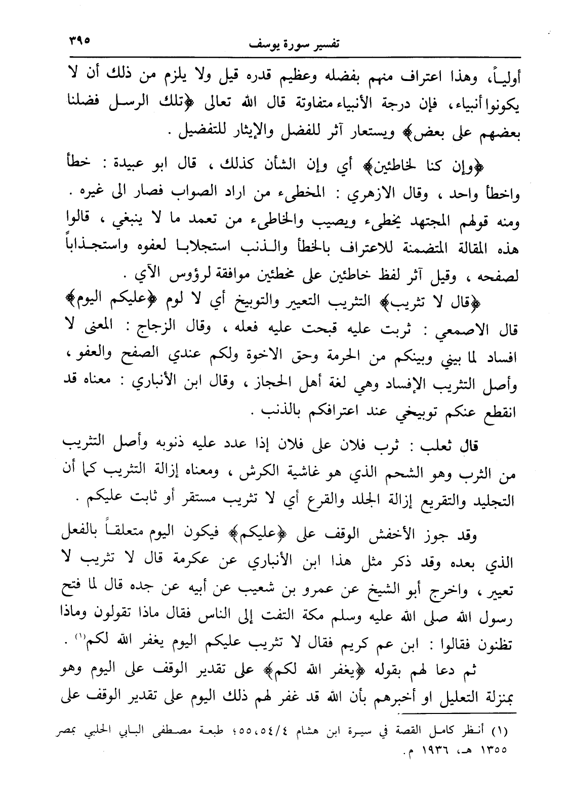 وقد جوز الأخفش الوقف على (عليكم) فيكون اليوم متعلقاً بالفعل الذي بعده وقد ذكر مثل هذا ابن الأنباري عن عكرمة قال لا تثريب لا تعيير، وأخرج أبو الشيخ عن عمرو بن شعيب عن أبيه عن جده قال لما فتح رسول الله صلى الله عليه وسلم مكة التفت إلى الناس فقال ماذا تقولون وماذا تظنون فقالوا: ابن عم كريم فقال لا تثريب عليكم اليوم يغفر الله لكم (¬1).