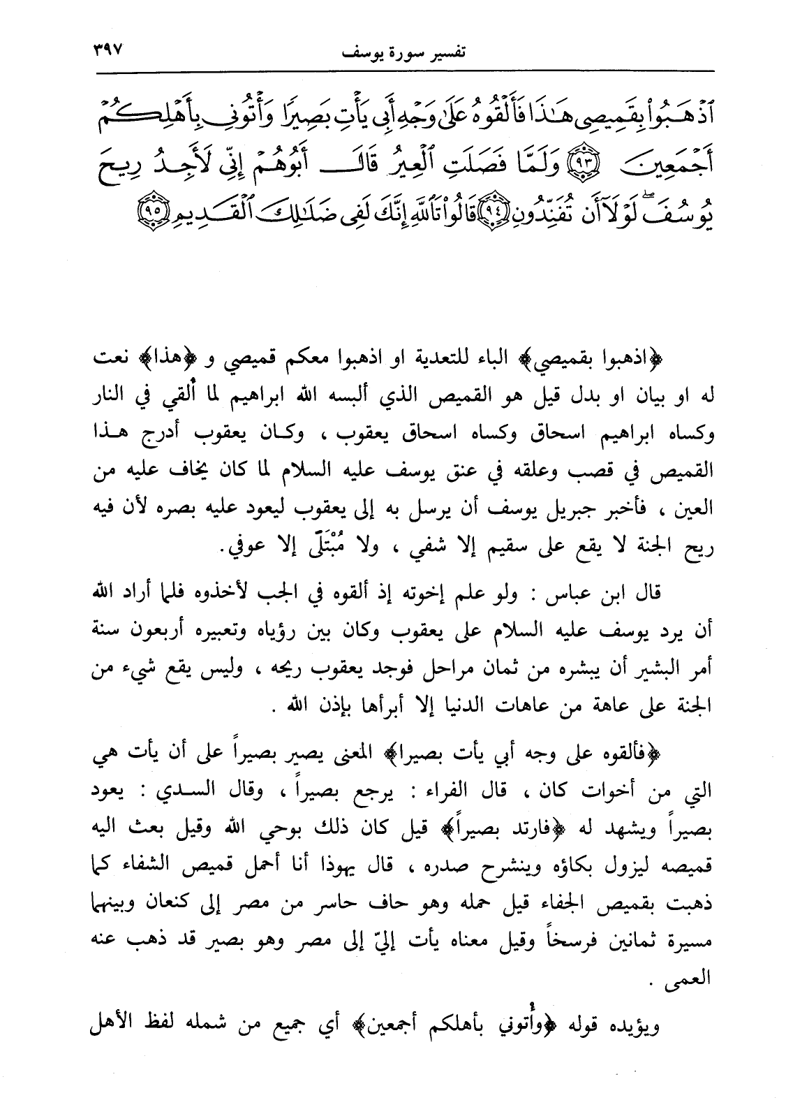 اذْهَبُوا بِقَمِيصِي هَذَا فَأَلْقُوهُ عَلَى وَجْهِ أَبِي يَأْتِ بَصِيرًا وَأْتُونِي بِأَهْلِكُمْ أَجْمَعِينَ (93) وَلَمَّا فَصَلَتِ الْعِيرُ قَالَ أَبُوهُمْ إِنِّي لَأَجِدُ رِيحَ يُوسُفَ لَوْلَا أَنْ تُفَنِّدُونِ (94) قَالُوا تَاللَّهِ إِنَّكَ لَفِي ضَلَالِكَ الْقَدِيمِ (95)