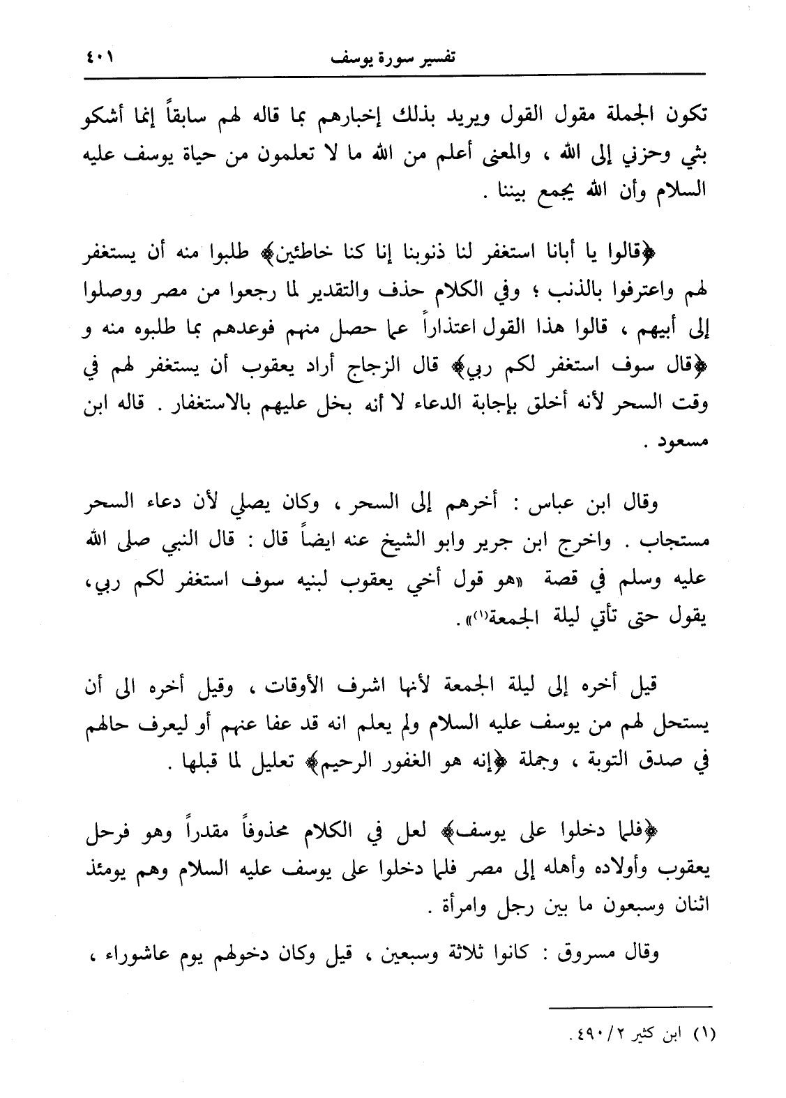 وقال ابن عباس: أخرهم إلى السحر، وكان يصلي لأن دعاء السحر مستجاب. وأخرج ابن جرير وأبو الشيخ عنه أيضاً قال: قال النبي صلى الله عليه وسلم في قصة " هو قول أخي يعقوب لبنيه سوف أستغفر لكم ربي، يقول حتى تأتي ليلة الجمعة (¬1) ".