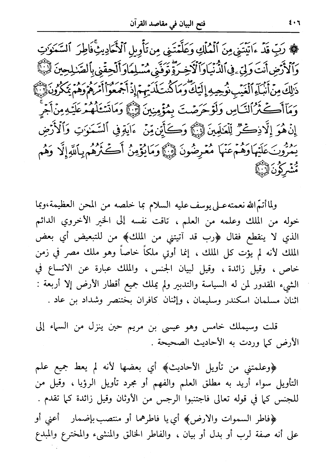 رَبِّ قَدْ آتَيْتَنِي مِنَ الْمُلْكِ وَعَلَّمْتَنِي مِنْ تَأْوِيلِ الْأَحَادِيثِ فَاطِرَ السَّمَاوَاتِ وَالْأَرْضِ أَنْتَ وَلِيِّي فِي الدُّنْيَا وَالْآخِرَةِ تَوَفَّنِي مُسْلِمًا وَأَلْحِقْنِي بِالصَّالِحِينَ (101) ذَلِكَ مِنْ أَنْبَاءِ الْغَيْبِ نُوحِيهِ إِلَيْكَ وَمَا كُنْتَ لَدَيْهِمْ إِذْ أَجْمَعُوا أَمْرَهُمْ وَهُمْ يَمْكُرُونَ (102) وَمَا أَكْثَرُ النَّاسِ وَلَوْ حَرَصْتَ بِمُؤْمِنِينَ (103) وَمَا تَسْأَلُهُمْ عَلَيْهِ مِنْ أَجْرٍ إِنْ هُوَ إِلَّا ذِكْرٌ لِلْعَالَمِينَ (104) وَكَأَيِّنْ مِنْ آيَةٍ فِي السَّمَاوَاتِ وَالْأَرْضِ يَمُرُّونَ عَلَيْهَا وَهُمْ عَنْهَا مُعْرِضُونَ (105) وَمَا يُؤْمِنُ أَكْثَرُهُمْ بِاللَّهِ إِلَّا وَهُمْ مُشْرِكُونَ (106)