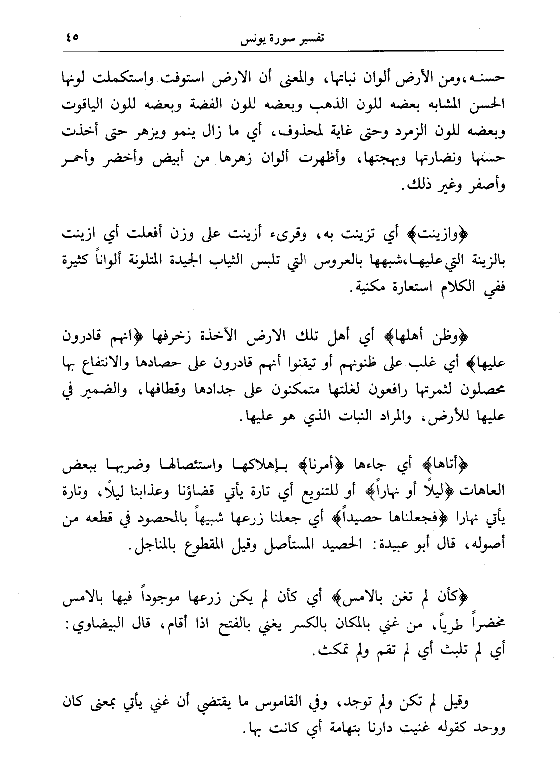 (كأن لم تغن بالأمس) أي كأن لم يكن زرعها موجوداً فيها بالأمس مخضراً طرداً، من غني بالمكان بالكسر يغني بالفتح إذا أقام، قال البيضاوي: أي لم تلبث أي لم تقم ولم تمكث.