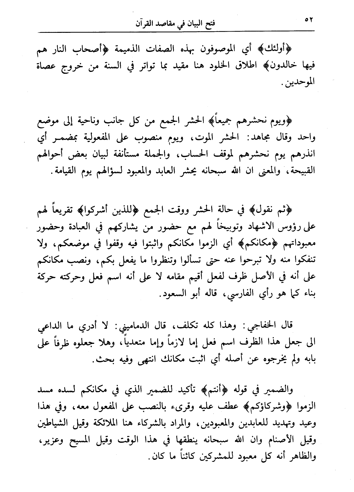 (ثم نقول) في حالة الحشر ووقت الجمع (للذين أشركوا) تقريعاً لهم على رؤوس الأشهاد وتوبيخاً لهم مع حضور من يشاركهم في العبادة وحضور معبوداتهم (مكانكم) أي الزموا مكانكم واثبتوا فيه وقفوا في موضعكم، ولا تنفكوا منه ولا تبرحوا عنه حتى تسألوا وتنظروا ما يفعل بكم، ونصب مكانكم على أنه في الأصل ظرف لفعل أقيم مقامه لا على أنه اسم فعل وحركته حركة بناء كما هو رأي الفارسي، قاله أبو السعود.