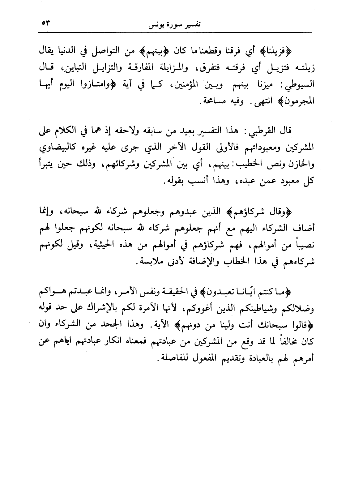 قال القرطبي: هذا التفسير بعيد من سابقه ولاحقه إذ هما في الكلام على المشركين ومعبوداتهم فالأولى القول الآخر الذي جرى عليه غيره كالبيضاوي والخازن ونص الخطيب: بينهم، أي بين المشركين وشركائهم، وذلك حين يتبرأ كل معبود عمن عبده، وهذا أنسب بقوله.