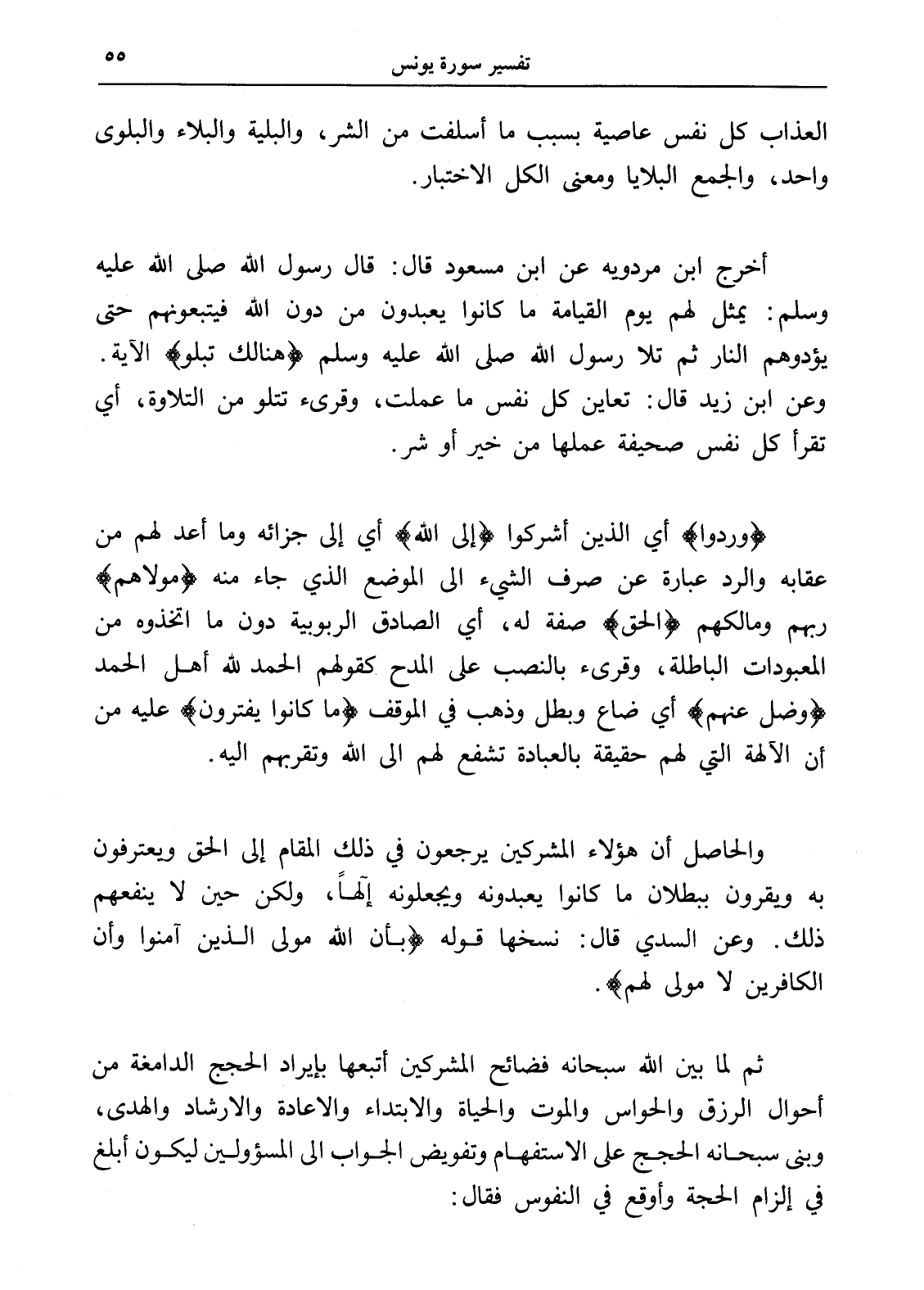 أخرج ابن مردويه عن ابن مسعود قال: قال رسول الله صلى الله عليه وسلم: يمثل لهم يوم القيامة ما كانوا يعبدون من دون الله فيتبعونهم حتى يؤدوهم النار ثم تلا رسول الله صلى الله عليه وسلم (هنالك تبلو) الآية.