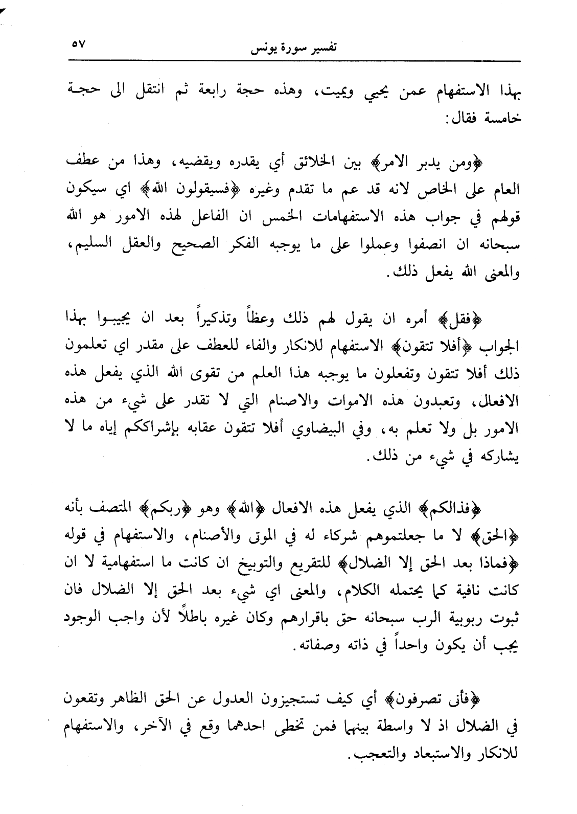 (فذللكم) الذي يفعل هذه الأفعال (الله) وهو (ربكم) المتصف بأنه (الحق) لا ما جعلتموهم شركاء له في الموتى والأصنام، والاستفهام في قوله (فماذا بعد الحق إلا الضلال) للتقريع والتوبيخ إن كانت ما استفهامية لا إن كانت نافية كما يحتمله الكلام، والمعنى أي شيء بعد الحق إلا الضلال فإن ثبوت ربوبية الرب سبحانه حق بإقرارهم وكان غيره باطلاً لأن واجب الوجود يجب أن يكون واحداً في ذاته وصفاته.