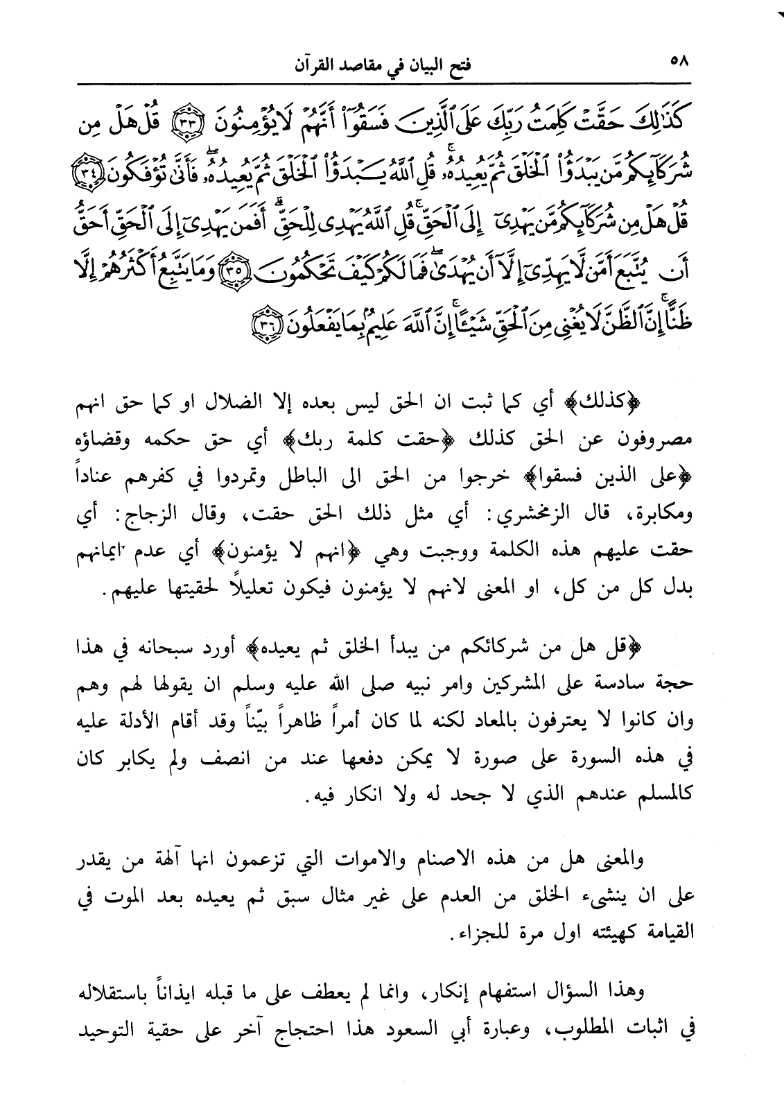 كَذَلِكَ حَقَّتْ كَلِمَتُ رَبِّكَ عَلَى الَّذِينَ فَسَقُوا أَنَّهُمْ لَا يُؤْمِنُونَ (33) قُلْ هَلْ مِنْ شُرَكَائِكُمْ مَنْ يَبْدَأُ الْخَلْقَ ثُمَّ يُعِيدُهُ قُلِ اللَّهُ يَبْدَأُ الْخَلْقَ ثُمَّ يُعِيدُهُ فَأَنَّى تُؤْفَكُونَ (34) قُلْ هَلْ مِنْ شُرَكَائِكُمْ مَنْ يَهْدِي إِلَى الْحَقِّ قُلِ اللَّهُ يَهْدِي لِلْحَقِّ أَفَمَنْ يَهْدِي إِلَى الْحَقِّ أَحَقُّ أَنْ يُتَّبَعَ أَمَّنْ لَا يَهِدِّي إِلَّا أَنْ يُهْدَى فَمَا لَكُمْ كَيْفَ تَحْكُمُونَ (35) وَمَا يَتَّبِعُ أَكْثَرُهُمْ إِلَّا ظَنًّا إِنَّ الظَّنَّ لَا يُغْنِي مِنَ الْحَقِّ شَيْئًا إِنَّ اللَّهَ عَلِيمٌ بِمَا يَفْعَلُونَ (36)