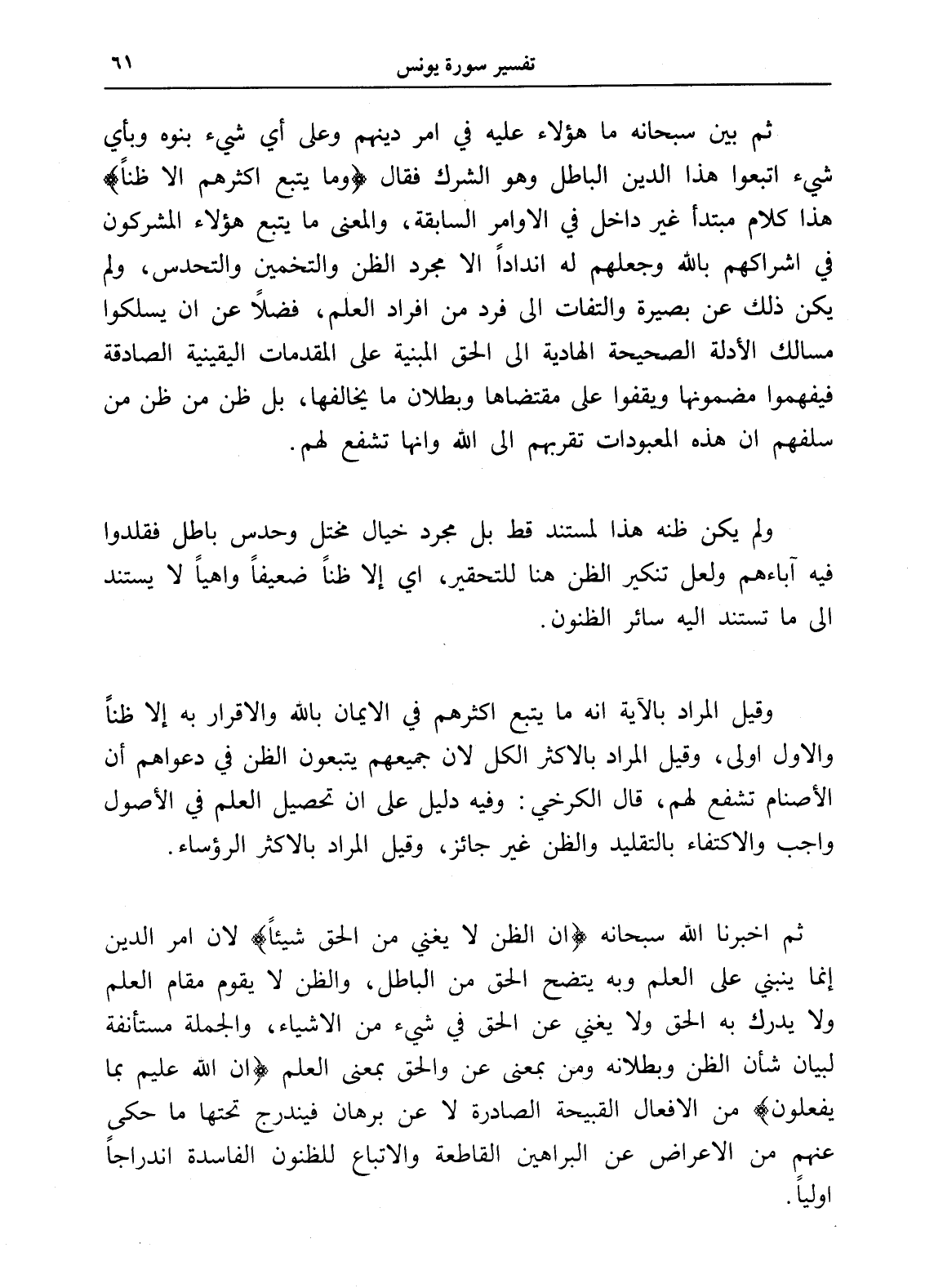 وقيل المراد بالآية أنه ما يتبع أكثرهم في الإيمان بالله والإقرار به إلا ظناً والأول أولى، وقيل المراد بالأكثر الكل لأن جميعهم يتبعون الظن في دعواهم أن الأصنام تشفع لهم، قال الكرخي: وفيه دليل على أن تحصيل العلم في الأصول واجب والاكتفاء بالتقليد والظن غير جائز، وقيل المراد بالأكثر الرؤساء.