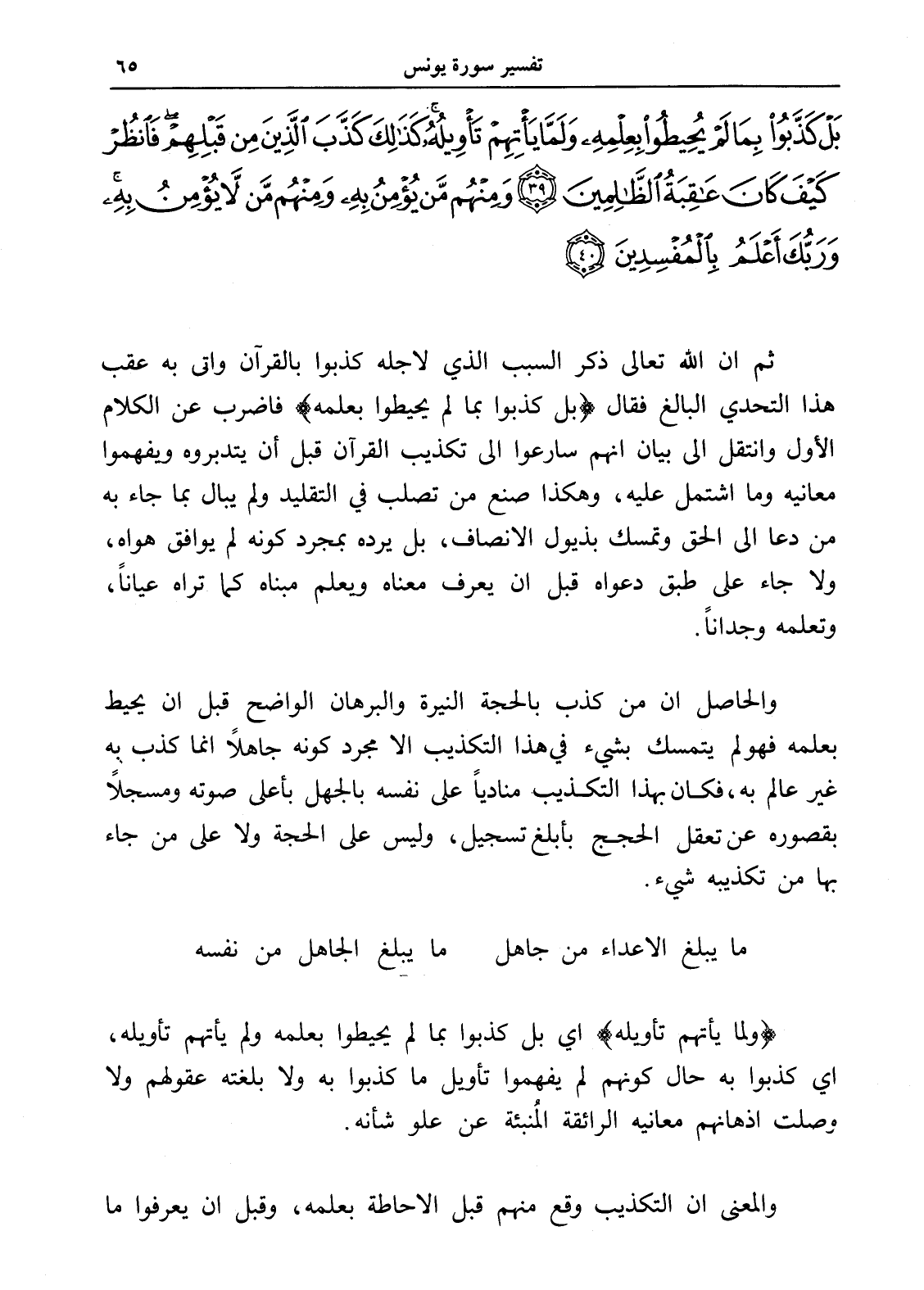 بَلْ كَذَّبُوا بِمَا لَمْ يُحِيطُوا بِعِلْمِهِ وَلَمَّا يَأْتِهِمْ تَأْوِيلُهُ كَذَلِكَ كَذَّبَ الَّذِينَ مِنْ قَبْلِهِمْ فَانْظُرْ كَيْفَ كَانَ عَاقِبَةُ الظَّالِمِينَ (39) وَمِنْهُمْ مَنْ يُؤْمِنُ بِهِ وَمِنْهُمْ مَنْ لَا يُؤْمِنُ بِهِ وَرَبُّكَ أَعْلَمُ بِالْمُفْسِدِينَ (40)