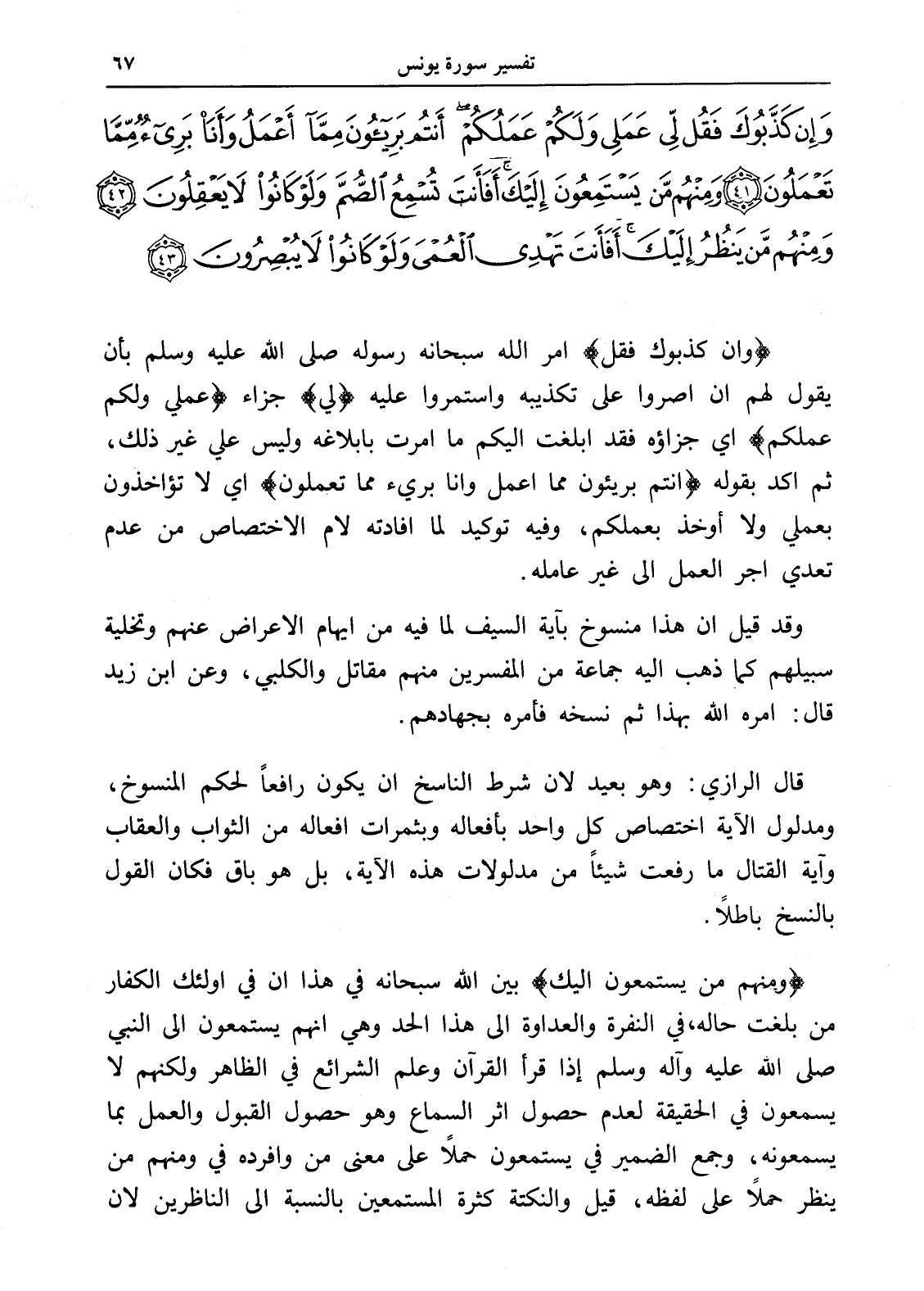 وَإِنْ كَذَّبُوكَ فَقُلْ لِي عَمَلِي وَلَكُمْ عَمَلُكُمْ أَنْتُمْ بَرِيئُونَ مِمَّا أَعْمَلُ وَأَنَا بَرِيءٌ مِمَّا تَعْمَلُونَ (41) وَمِنْهُمْ مَنْ يَسْتَمِعُونَ إِلَيْكَ أَفَأَنْتَ تُسْمِعُ الصُّمَّ وَلَوْ كَانُوا لَا يَعْقِلُونَ (42) وَمِنْهُمْ مَنْ يَنْظُرُ إِلَيْكَ أَفَأَنْتَ تَهْدِي الْعُمْيَ وَلَوْ كَانُوا لَا يُبْصِرُونَ (43)