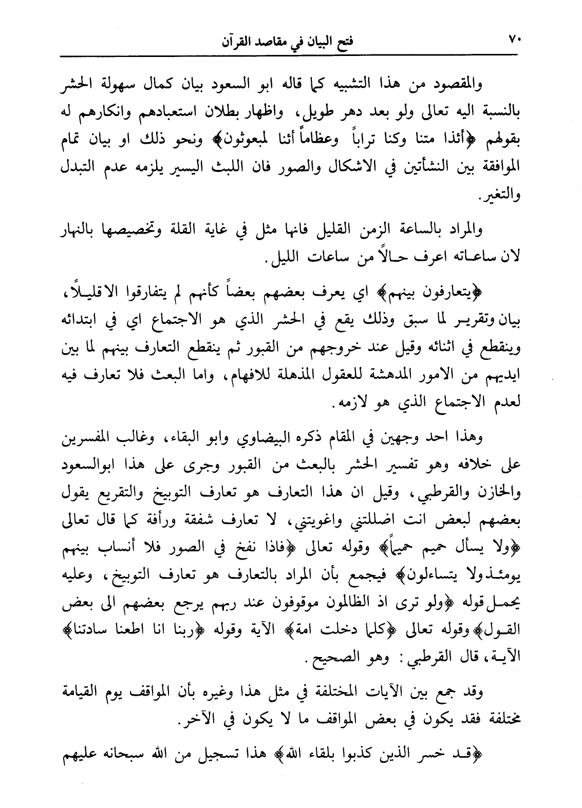 وهذا أحد وجهين في المقام ذكره البيضاوي وأبو البقاء، وغالب المفسرين على خلافه وهو تفسير الحشر بالبعث من القبور وجرى على هذا أبو السعود والخازن والقرطبي، وقيل أن هذا التعارف هو تعارف التوبيخ والتقريع يقول بعضهم لبعض أنت أضللتني وأغويتني، لا تعارف شفقة ورأفة كما قال تعالى (ولا يسأل حميم حميماً) وقوله تعالى (فإذا نفخ في الصور فلا أنساب بينهم يومئذ ولا يتساءلون) فيجمع بأن المراد بالتعارف هو تعارف التوبيخ، وعليه يحمل قوله (ولو ترى إذ الظالمون موقوفون عند ربهم يرجع بعضهم إلى بعض القول) وقوله تعالى (كلما دخلت أمة) الآية وقوله (ربنا إنا أطعنا سادتنا) الآية، قال القرطبي: وهو الصحيح.