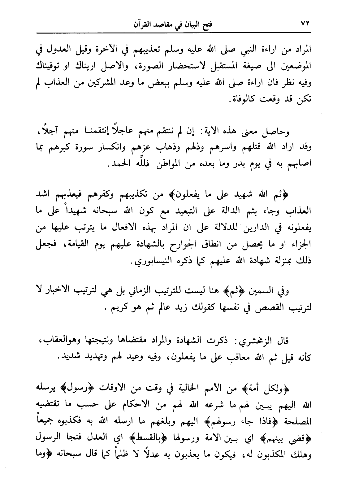 (ولكل أمة) من الأمم الخالية في وقت من الأوقات (رسول) يرسله الله إليهم يبين لهم ما شرعه الله لهم من الأحكام على حسب ما تقتضيه المصلحة (فإذا جاء رسولهم) إليهم وبلغهم ما أرسله الله به فكذبوه جميعاً (قضى بينهم) أي بين الأمة ورسولها (بالقسط) أي العدل فنجا الرسول وهلك المكذبون له، فيكون ما يعذبون به عدلاً لا ظلماً كما قال سبحانه (وما