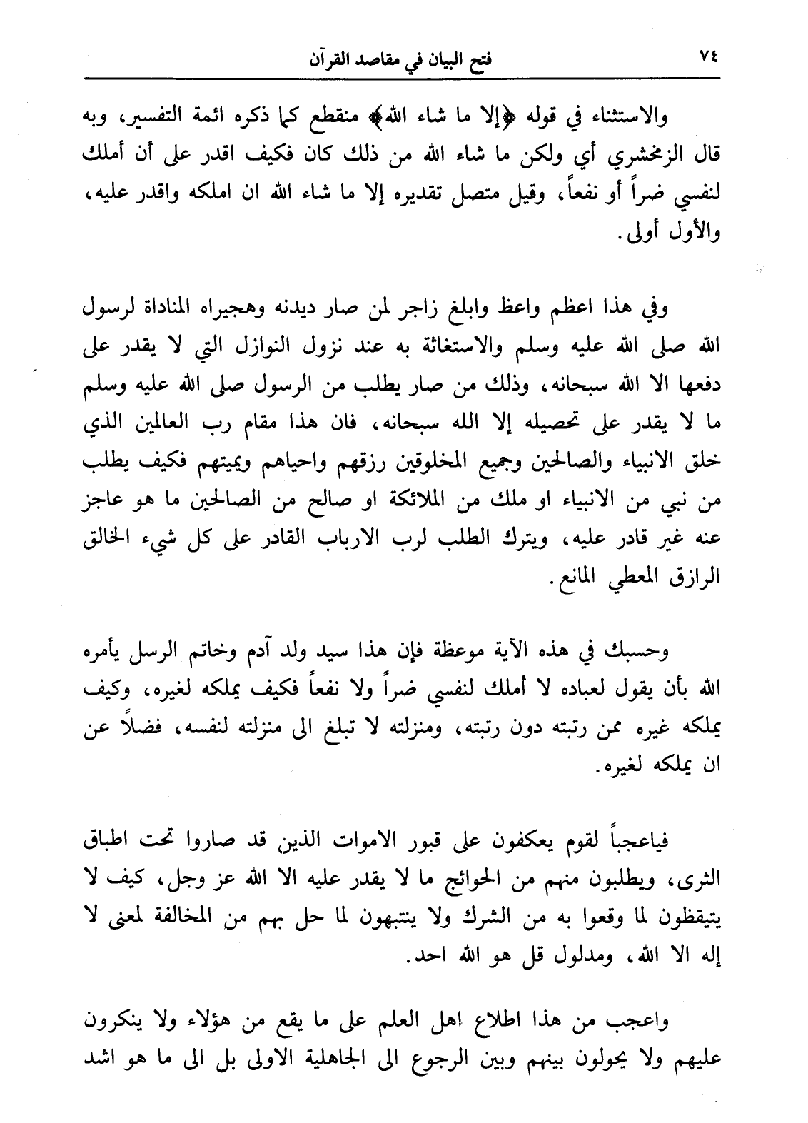 وحسبك في هذه الآية موعظة فإن هذا سيد ولد آدم وخاتم الرسل يأمره الله بأن يقول لعباده لا أملك لنفسي ضراً ولا نفعاً فكيف يملكه لغيره، وكيف يملكه غيره ممن رتبته دون رتبته، ومنزلته لا تبلغ إلى منزلته لنفسه، فضلاً عن أن يملكه لغيره.