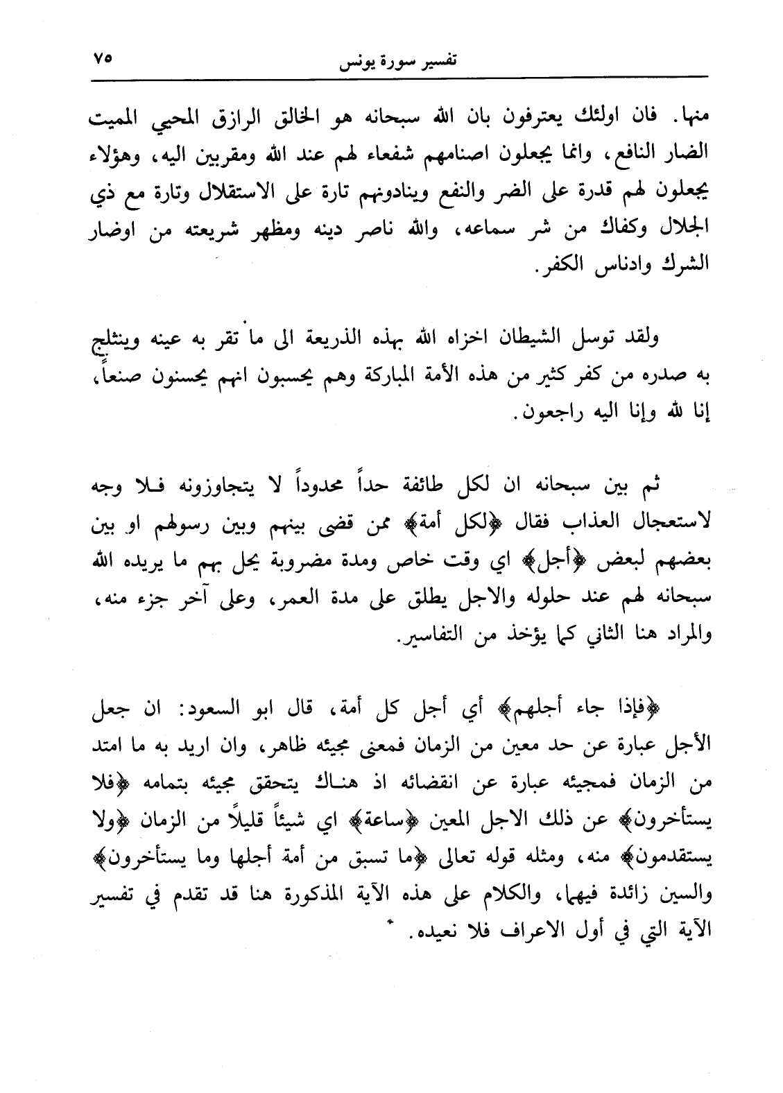 (فإذا جاء أجلهم) أي أجل كل أمة، قال أبو السعود: أن جعل الأجل عبارة عن حد معين من الزمان فمعنى مجيئه ظاهر، وأن أريد به ما امتد من الزمان فمجيئه عبارة عن انقضائه إذ هناك يتحقق مجيئه بتمامه (فلا يستأخرون) عن ذلك الأجل المعين (ساعة) أي شيئاً قليلاً من الزمان (ولا يستقدمون) منه، ومثله قوله تعالى (ما تسبق من أمة أجلها وما يستأخرون) والسين زائدة فيهما، والكلام على هذه الآية المذكورة هنا قد تقدم في تفسير الآية التي في أول الأعراف فلا نعيده.