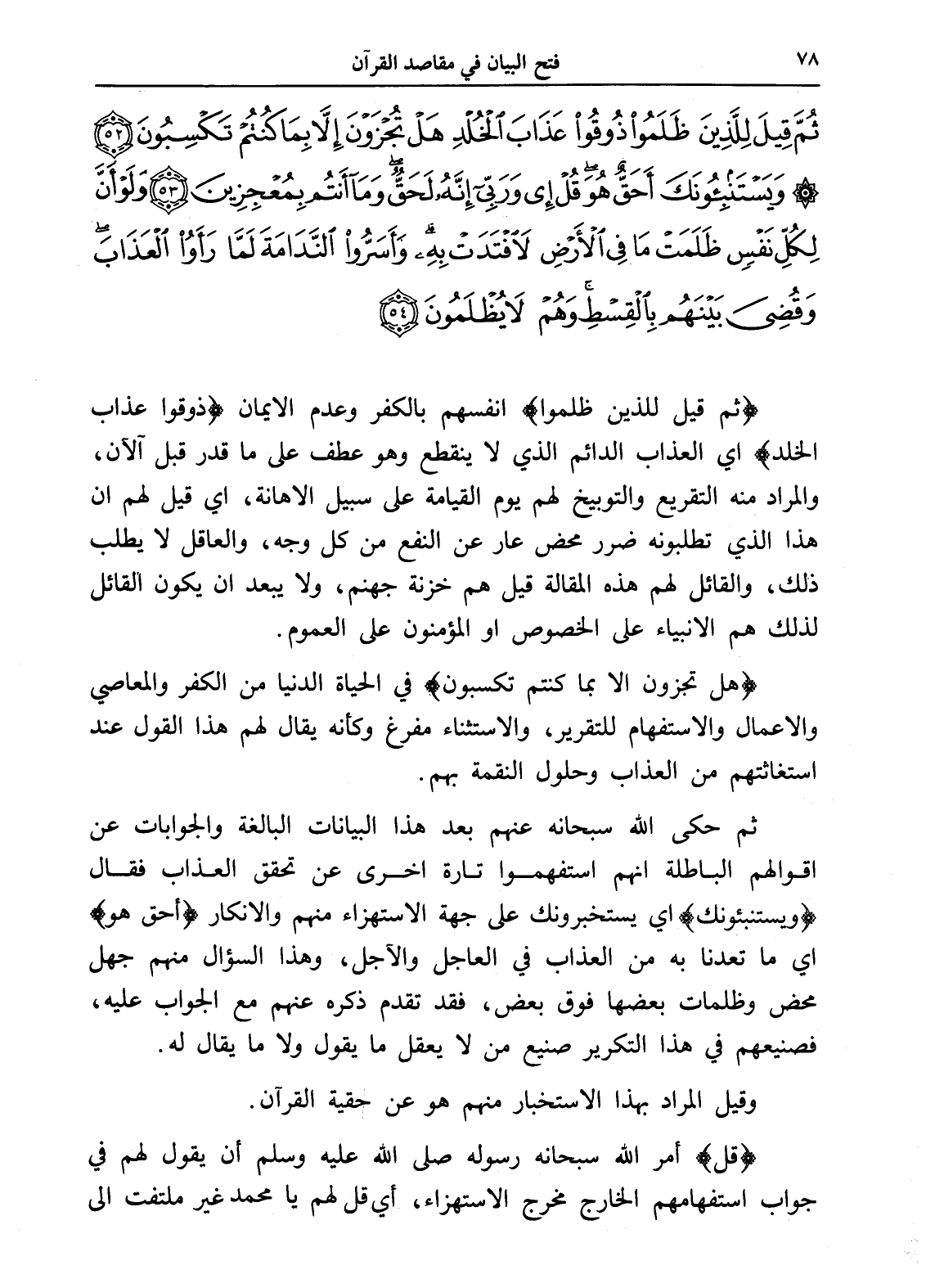 ثُمَّ قِيلَ لِلَّذِينَ ظَلَمُوا ذُوقُوا عَذَابَ الْخُلْدِ هَلْ تُجْزَوْنَ إِلَّا بِمَا كُنْتُمْ تَكْسِبُونَ (52) وَيَسْتَنْبِئُونَكَ أَحَقٌّ هُوَ قُلْ إِي وَرَبِّي إِنَّهُ لَحَقٌّ وَمَا أَنْتُمْ بِمُعْجِزِينَ (53) وَلَوْ أَنَّ لِكُلِّ نَفْسٍ ظَلَمَتْ مَا فِي الْأَرْضِ لَافْتَدَتْ بِهِ وَأَسَرُّوا النَّدَامَةَ لَمَّا رَأَوُا الْعَذَابَ وَقُضِيَ بَيْنَهُمْ بِالْقِسْطِ وَهُمْ لَا يُظْلَمُونَ (54)