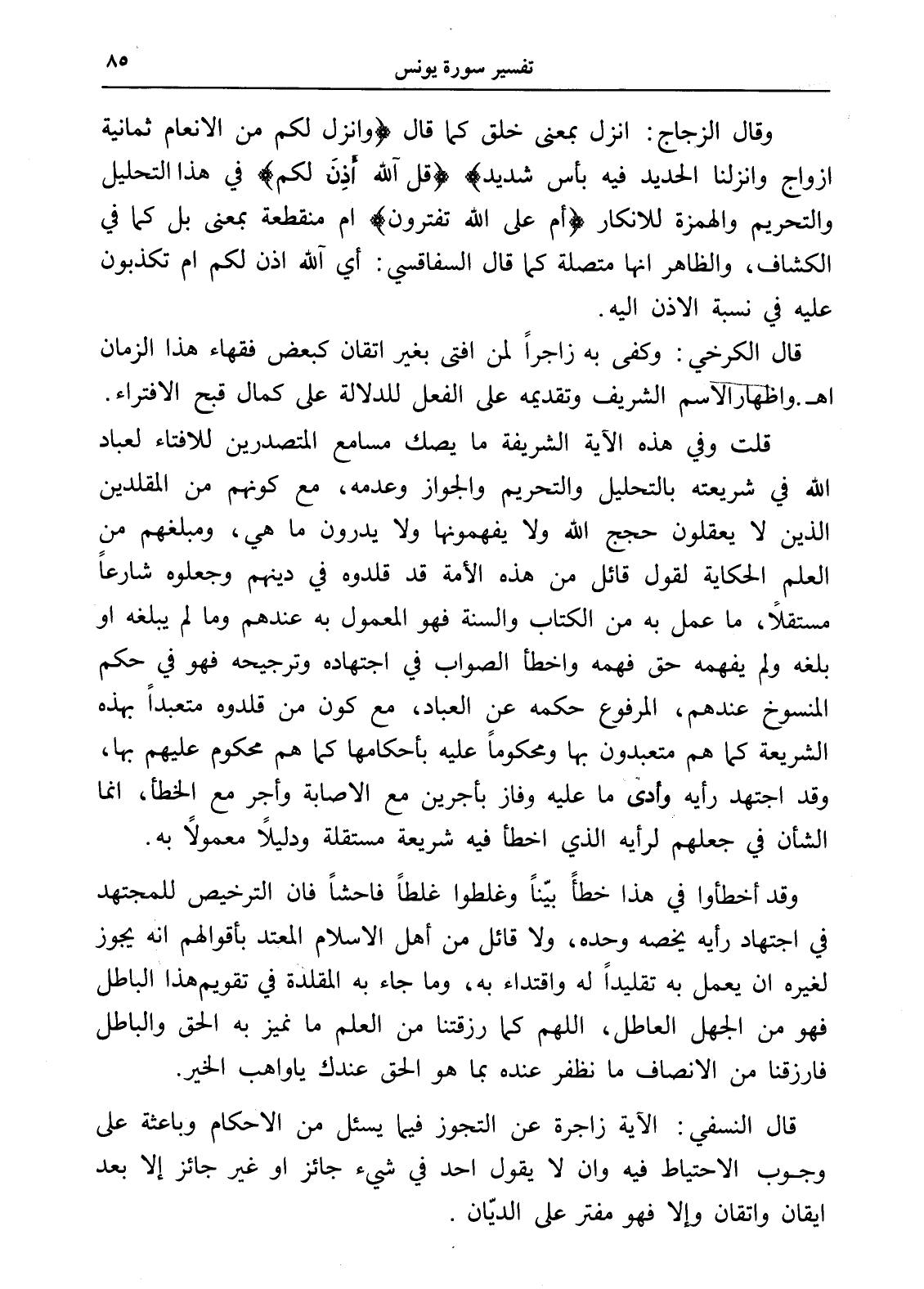 قلت وفي هذه الآية الشريفة ما يصك مسامع المتصدرين للإفتاء لعباد الله في شريعته بالتحليل والتحريم والجواز وعدمه، مع كونهم من المقلدين الذين لا يعقلون حجج الله ولا يفهمونها ولا يدرون ما هي، ومبلغهم من العلم الحكاية لقول قائل من هذه الأمة قد قلدوه في دينهم وجعلوه شارعاً مستقلاً، ما عمل به من الكتاب والسنة فهو العمول به عندهم وما لم يبلغه أو بلغه ولم يفهمه حق فهمه وأخطأ الصواب في اجتهاده وترجيحه فهو في حكم المنسوخ عندهم، المرفوع حكمه عن العباد، مع كون من قلدوه متعبداً بهذه الشريعة كما هم متعبدون بها ومحكوماً عليه بأحكامها كما هم محكوم عليهم بها، وقد اجتهد رأيه وأدى ما عليه وفاز بأجرين مع الإصابة وأجر مع الخطأ، إنما الشأن في جعلهم لرأيه الذي أخطأ فيه شريعة مستقلة ودليلاً معمولاً به.