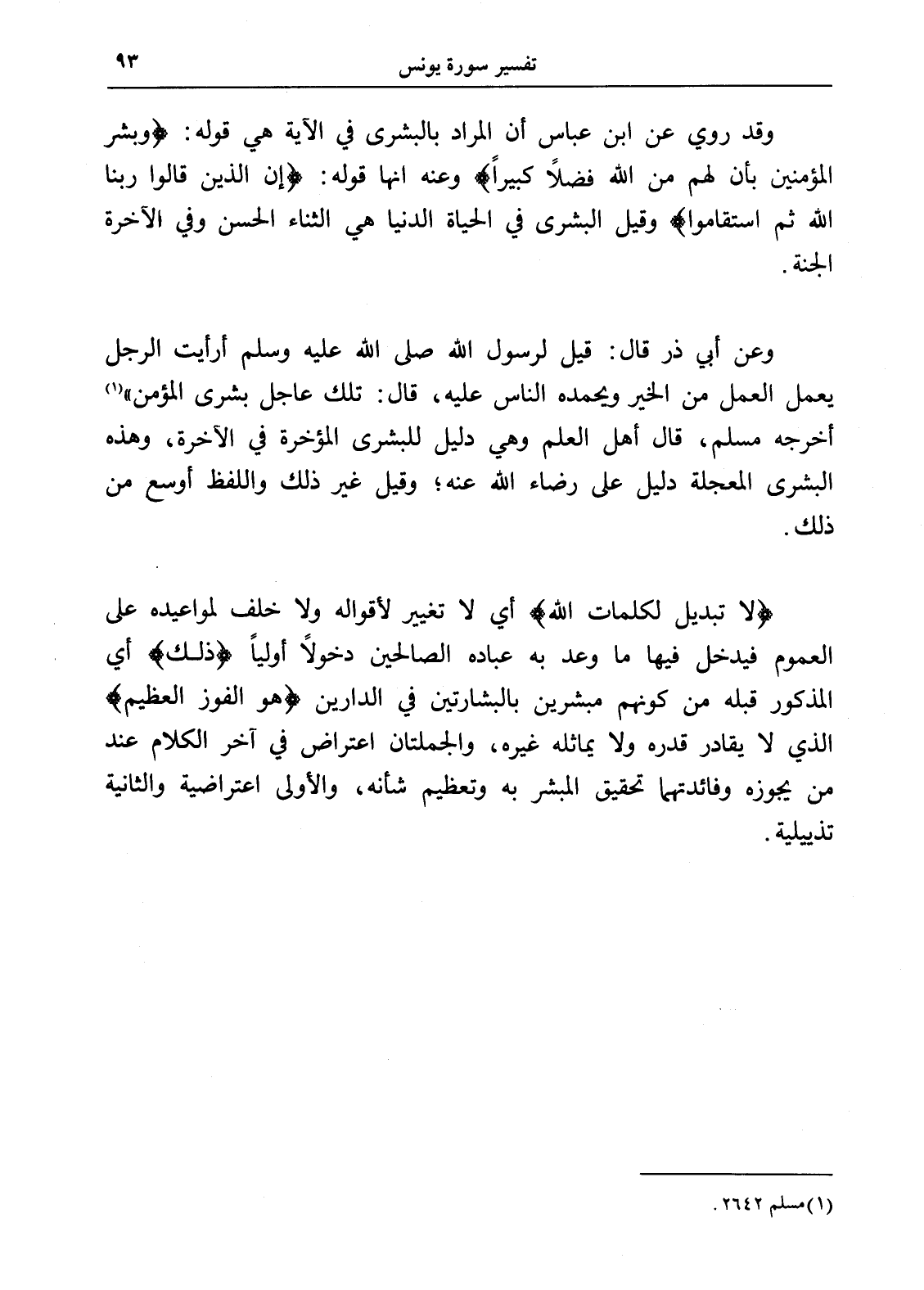 وقد روي عن ابن عباس أن المراد بالبشرى في الآية هي قوله: (وبشر المؤمنين بأن لهم من الله فضلاً كبيراً) وعنه أنها قوله: (إن الذين قالوا ربنا الله ثم استقاموا) وقيل البشرى في الحياة الدنيا هي الثناء الحسن وفي الآخرة الجنة.