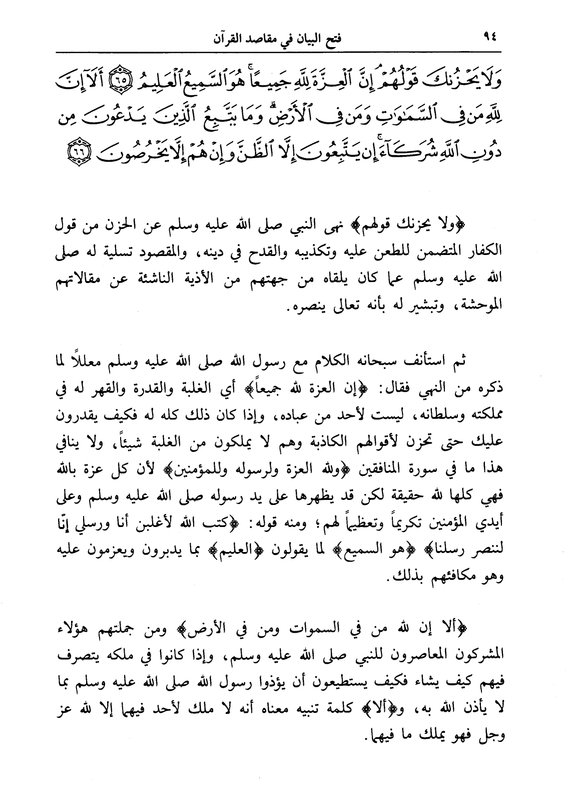 وَلَا يَحْزُنْكَ قَوْلُهُمْ إِنَّ الْعِزَّةَ لِلَّهِ جَمِيعًا هُوَ السَّمِيعُ الْعَلِيمُ (65) أَلَا إِنَّ لِلَّهِ مَنْ فِي السَّمَاوَاتِ وَمَنْ فِي الْأَرْضِ وَمَا يَتَّبِعُ الَّذِينَ يَدْعُونَ مِنْ دُونِ اللَّهِ شُرَكَاءَ إِنْ يَتَّبِعُونَ إِلَّا الظَّنَّ وَإِنْ هُمْ إِلَّا يَخْرُصُونَ (66)
