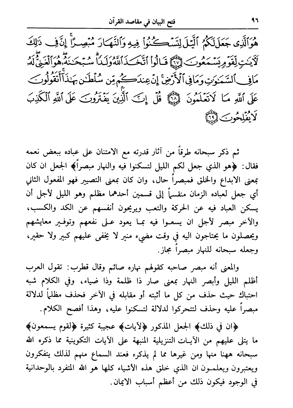 هُوَ الَّذِي جَعَلَ لَكُمُ اللَّيْلَ لِتَسْكُنُوا فِيهِ وَالنَّهَارَ مُبْصِرًا إِنَّ فِي ذَلِكَ لَآيَاتٍ لِقَوْمٍ يَسْمَعُونَ (67) قَالُوا اتَّخَذَ اللَّهُ وَلَدًا سُبْحَانَهُ هُوَ الْغَنِيُّ لَهُ مَا فِي السَّمَاوَاتِ وَمَا فِي الْأَرْضِ إِنْ عِنْدَكُمْ مِنْ سُلْطَانٍ بِهَذَا أَتَقُولُونَ عَلَى اللَّهِ مَا لَا تَعْلَمُونَ (68) قُلْ إِنَّ الَّذِينَ يَفْتَرُونَ عَلَى اللَّهِ الْكَذِبَ لَا يُفْلِحُونَ (69)