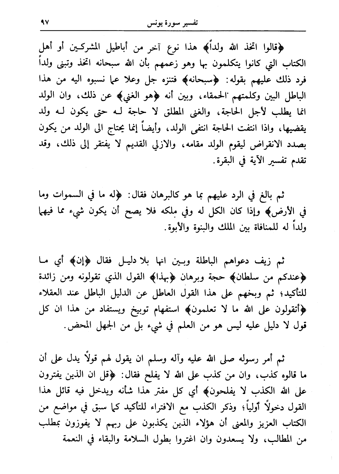 (قالوا اتخذ الله ولداً) هذا نوع آخر من أباطيل المشركين أو أهل الكتاب التي كانوا يتكلمون بها وهو زعمهم بأن الله سبحانه اتخذ وتبنى ولداً فرد ذلك عليهم بقوله: (سبحانه) فتنزه جل وعلا عما نسبوه إليه من هذا الباطل البين وكلمتهم الحمقاء، وبين أنه (هو الغني) عن ذلك، وأن الولد إنما يطلب لأجل الحاجة، والغنى المطلق لا حاجة له حتى يكون له ولد يقضيها، وإذا انتفت الحاجة انتفى الولد، وأيضاً إنما يحتاج إلى الولد من يكون بصدد الانقراض ليقوم الولد مقامه، والأزلي القديم لا يفتقر إلى ذلك، وقد تقدم تفسير الآية في البقرة.
