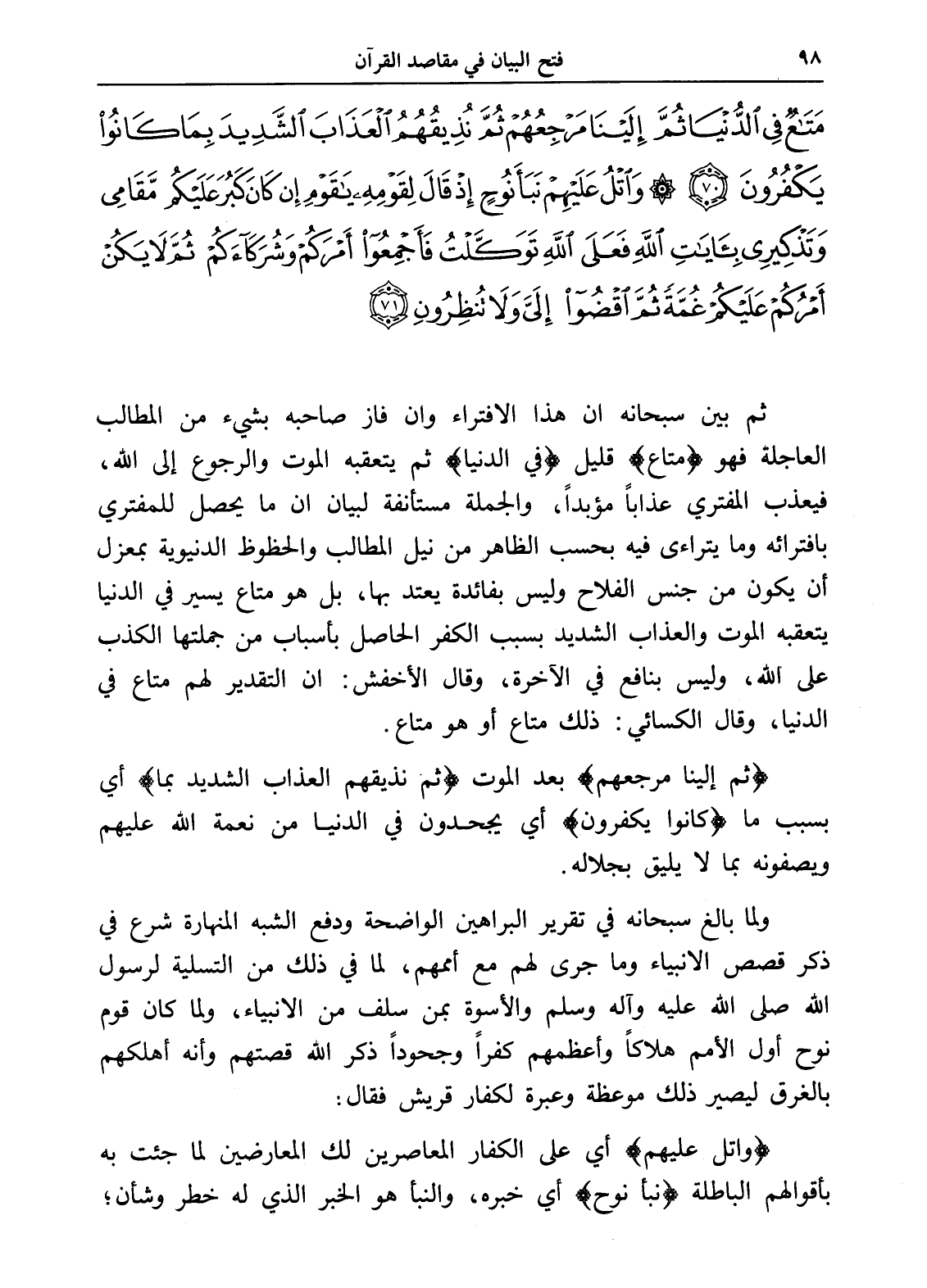 مَتَاعٌ فِي الدُّنْيَا ثُمَّ إِلَيْنَا مَرْجِعُهُمْ ثُمَّ نُذِيقُهُمُ الْعَذَابَ الشَّدِيدَ بِمَا كَانُوا يَكْفُرُونَ (70) وَاتْلُ عَلَيْهِمْ نَبَأَ نُوحٍ إِذْ قَالَ لِقَوْمِهِ يَا قَوْمِ إِنْ كَانَ كَبُرَ عَلَيْكُمْ مَقَامِي وَتَذْكِيرِي بِآيَاتِ اللَّهِ فَعَلَى اللَّهِ تَوَكَّلْتُ فَأَجْمِعُوا أَمْرَكُمْ وَشُرَكَاءَكُمْ ثُمَّ لَا يَكُنْ أَمْرُكُمْ عَلَيْكُمْ غُمَّةً ثُمَّ اقْضُوا إِلَيَّ وَلَا تُنْظِرُونِ (71)