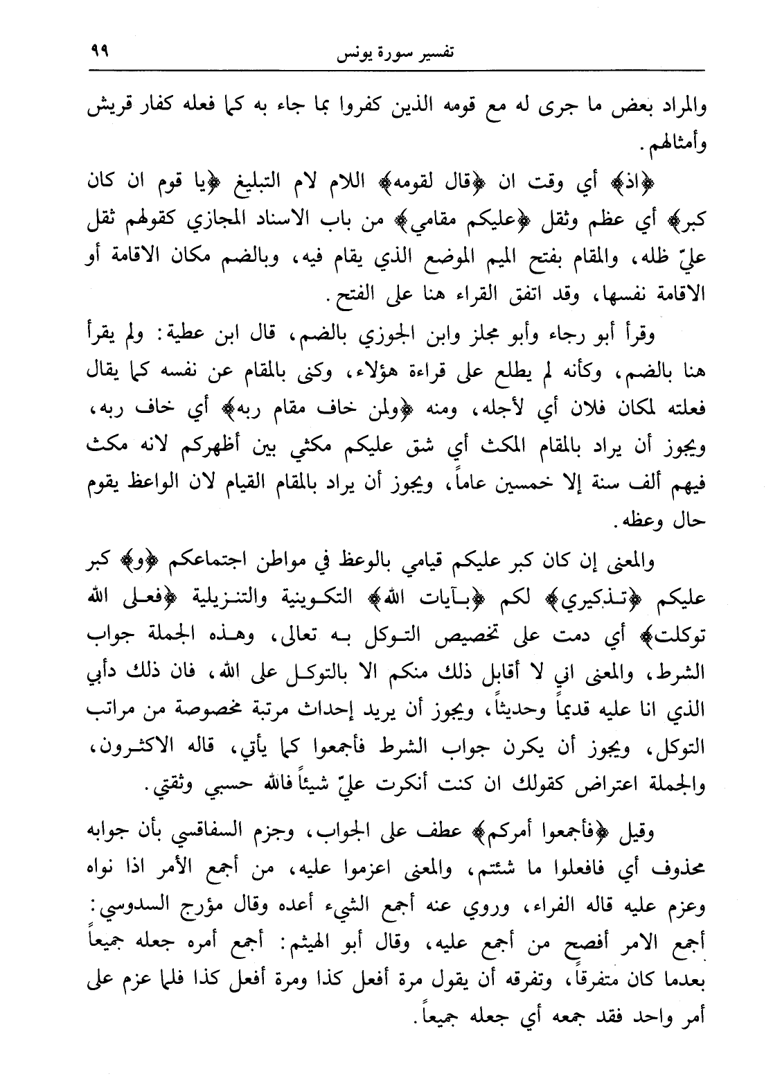 (إذ) أي وقت أن (قال لقومه) اللام لام التبليغ (يا قوم إن كان كبر) أي عظم وثقل (عليكم مقامي) من باب الإسناد المجازي كقولهم ثقل عليّ ظله، والمقام بفتح الميم الموضع الذي يقام فيه، وبالضم مكان الإقامة أو الإقامة نفسها، وقد اتفق القراء هنا على الفتح.