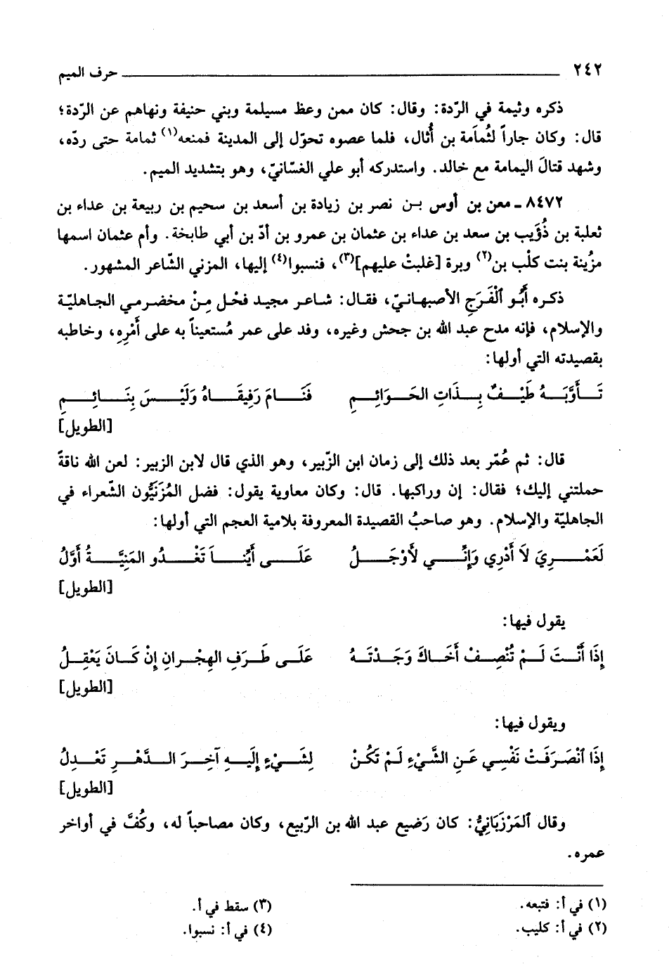 [الطويل] قال: ثم عمّر بعد ذلك إلى زمان ابن الزّبير، وهو الّذي قال لابن الزبير: لعن اللَّه ناقة- حملتني إليك، فقال: إن وراكبها. قال: وكان معاوية يقول: فضل المزنيّون الشّعراء في الجاهليّة والإسلام. وهو صاحب القصيدة المعروفة بلامية العجم التي أولها: