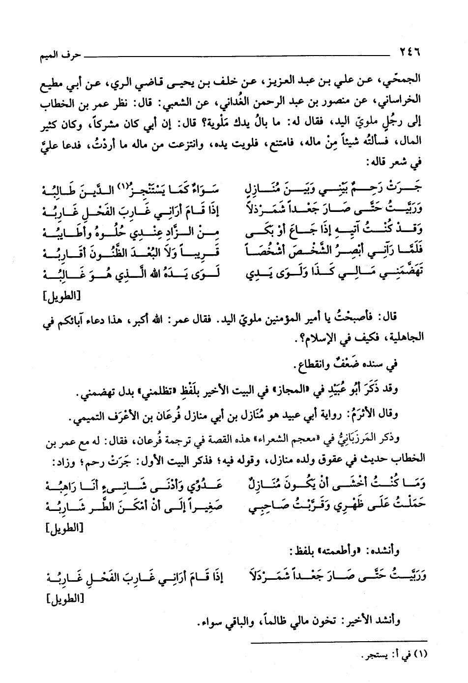 الجمحيّ، عن علي بن عبد العزيز، عن خلف بن يحيى قاضي الري، عن أبي مطيع الخراساني، عن منصور بن عبد الرحمن الغداني، عن الشعبي: قال: نظر عمر بن الخطاب إلى رجل ملويّ اليد، فقال له: ما بال يدك ملوية؟ قال: إن أبي كان مشركا، وكان كثير المال، فسألته شيئا من ماله، فامتنع، فلويت يده، وانتزعت من ماله ما أردت، فدعا عليّ في شعر قاله: