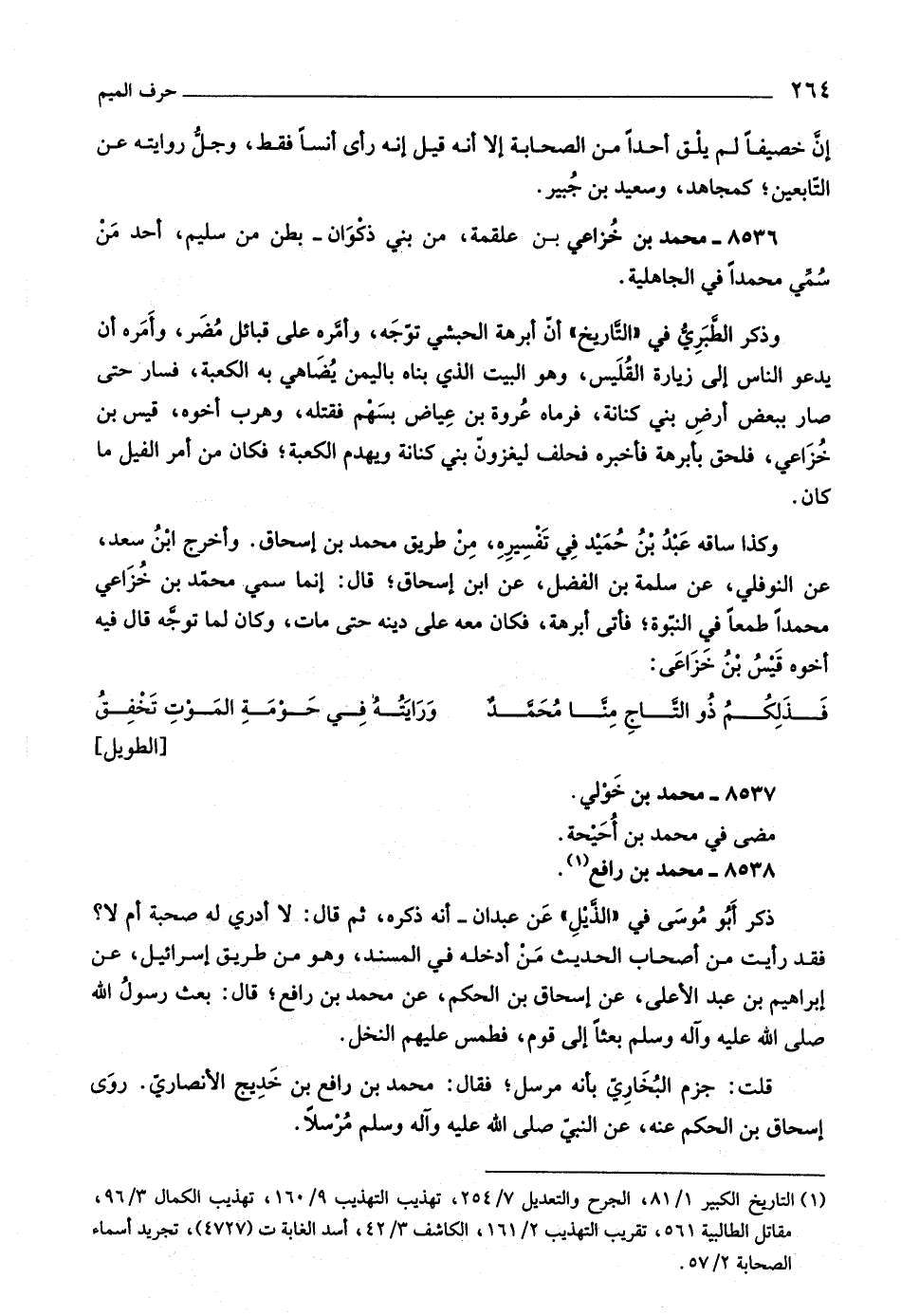 وكذا ساقه عبد بن حميد في تفسيره، من طريق محمد بن إسحاق. وأخرج ابن سعد، عن النوفلي، عن سلمة بن الفضل، عن ابن إسحاق، قال: إنما سمي محمّد بن خزاعيّ محمدا طمعا في النبوّة، فأتى أبرهة، فكان معه على دينه حتى مات، وكان لما توجّه قال فيه أخوه قيس بن خزاعيّ:
