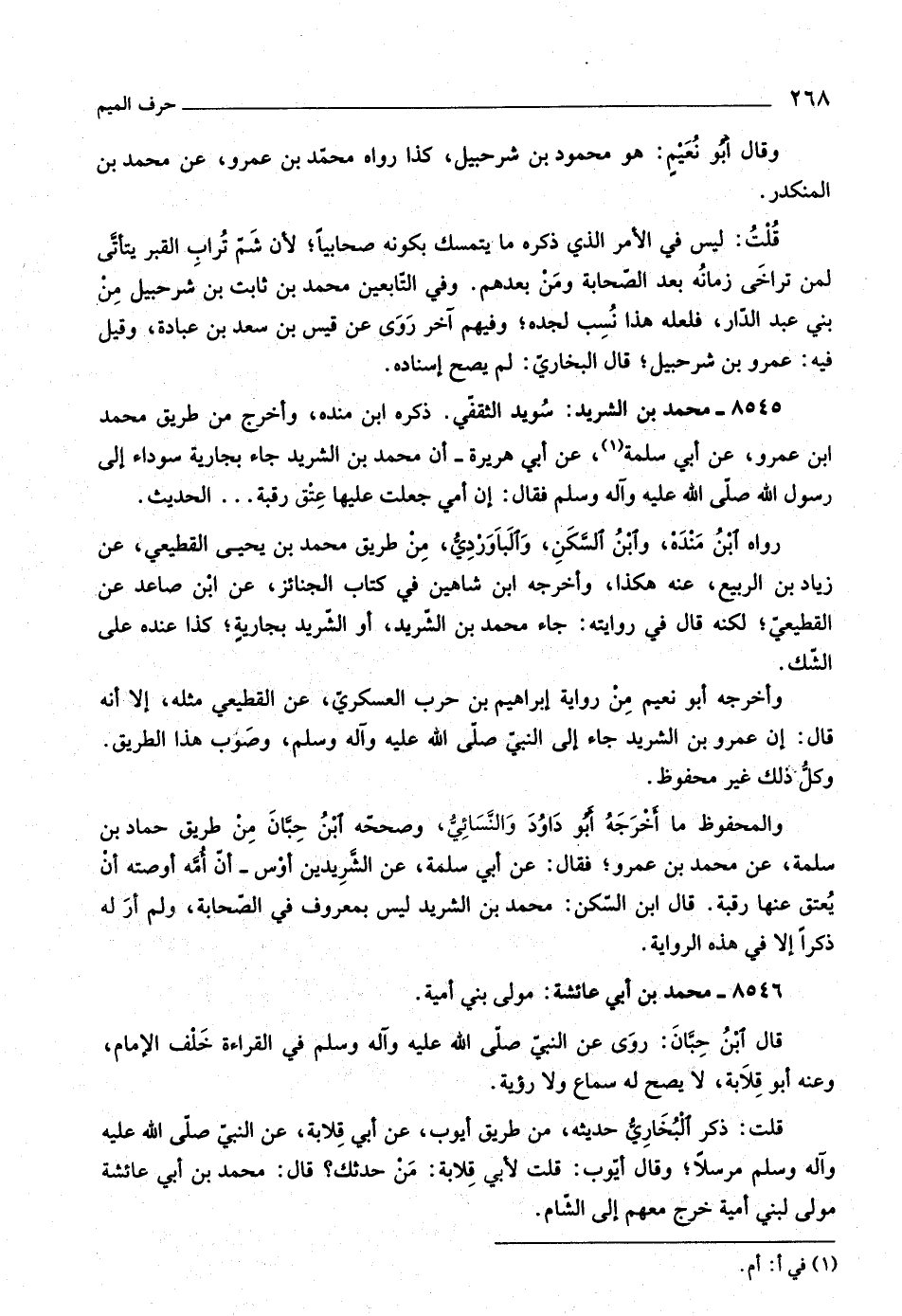 والمحفوظ ما أخرجه أبو داود والنّسائيّ، وصحّحه ابن حبّان من طريق حماد بن سلمة، عن محمد بن عمرو، فقال: عن أبي سلمة، عن الشّريدين أوس- أنّ أمّه أوصته أن يعتق عنها رقبة. قال ابن السّكن: محمد بن الشريد ليس بمعروف في الصّحابة، ولم أر له ذكرا إلا في هذه الرواية.