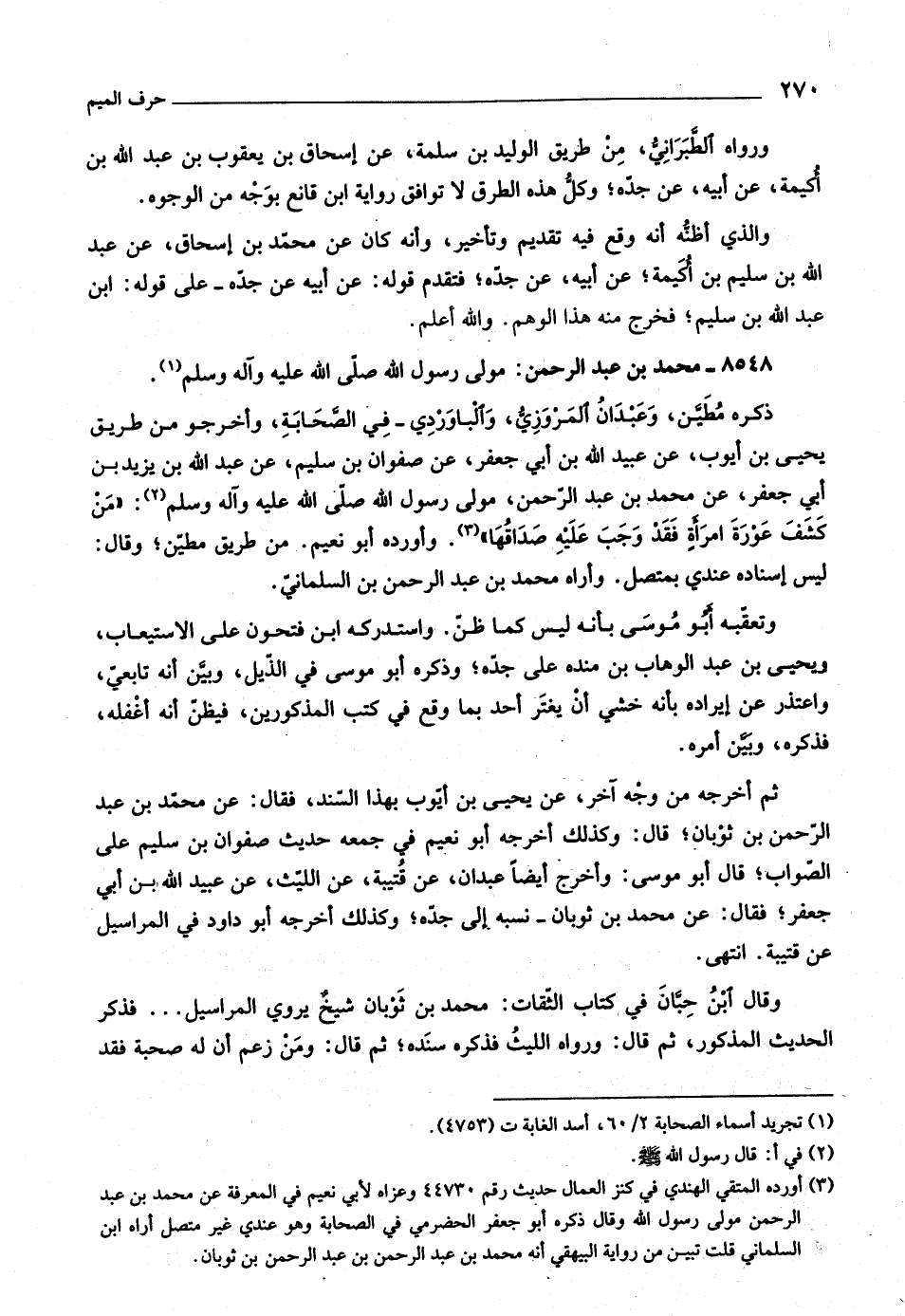 (٣) أورده المتقي الهندي في كنز العمال حديث رقم ٤٤٧٣٠ وعزاه لأبي نعيم في المعرفة عن محمد بن عبد الرحمن مولى رسول اللَّه وقال ذكره أبو جعفر الحضرميّ في الصحابة وهو عندي غير متصل أراه ابن السلماني قلت تبين من رواية البيهقي أنه محمد بن عبد الرحمن بن عبد الرحمن بن ثوبان.