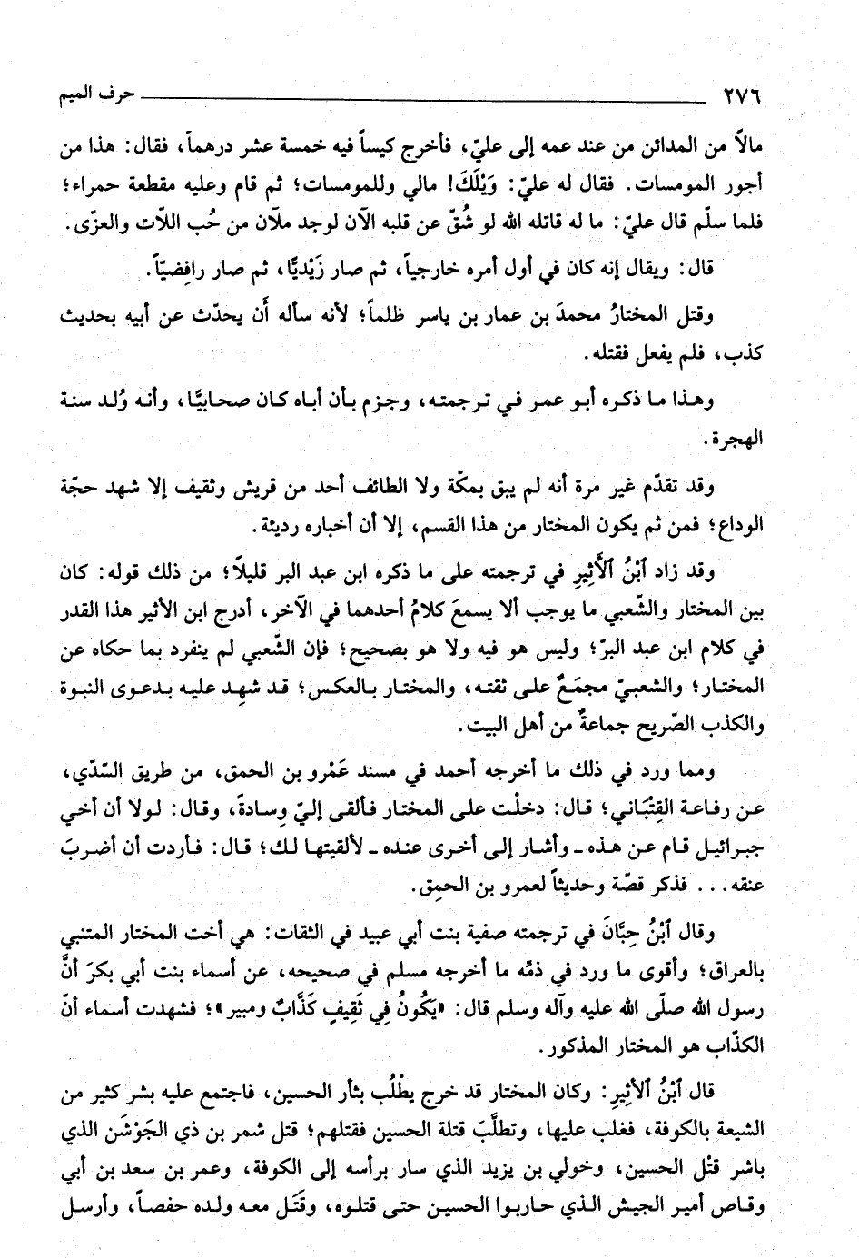 وقد زاد ابن الأثير في ترجمته على ما ذكره ابن عبد البر قليلا، من ذلك قوله: كان بين المختار والشّعبي ما يوجب ألا يسمع كلام أحدهما في الآخر، أدرج ابن الأثير هذا القدر في كلام ابن عبد البرّ، وليس هو فيه ولا هو بصحيح، فإن الشّعبي لم ينفرد بما حكاه عن المختار، والشعبيّ مجمع على ثقته، والمختار بالعكس، قد شهد عليه بدعوى النبوة والكذب الصّريح جماعة من أهل البيت.