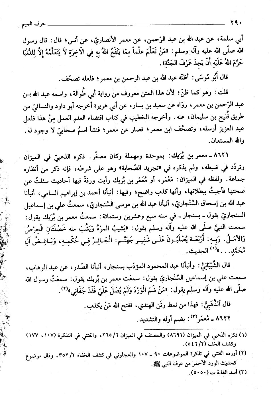 قلت: وهو كما ظنّ، لأن هذا المتن معروف من رواية أبي طوالة، واسمه عبد اللَّه بن عبد الرّحمن بن معمر، رواه عن سعيد بن يسار، عن أبي هريرة أخرجه أبو داود والنسائيّ من طريق فليح بن سليمان، عنه. وأخرجه الخطيب في كتاب اقتضاء العلم العمل من هذا فلعل عبد العزيز أرسله، وتصحّف ابن معمر، فصار عن معمر، فنشأ اسم صحابيّ لا وجود له.