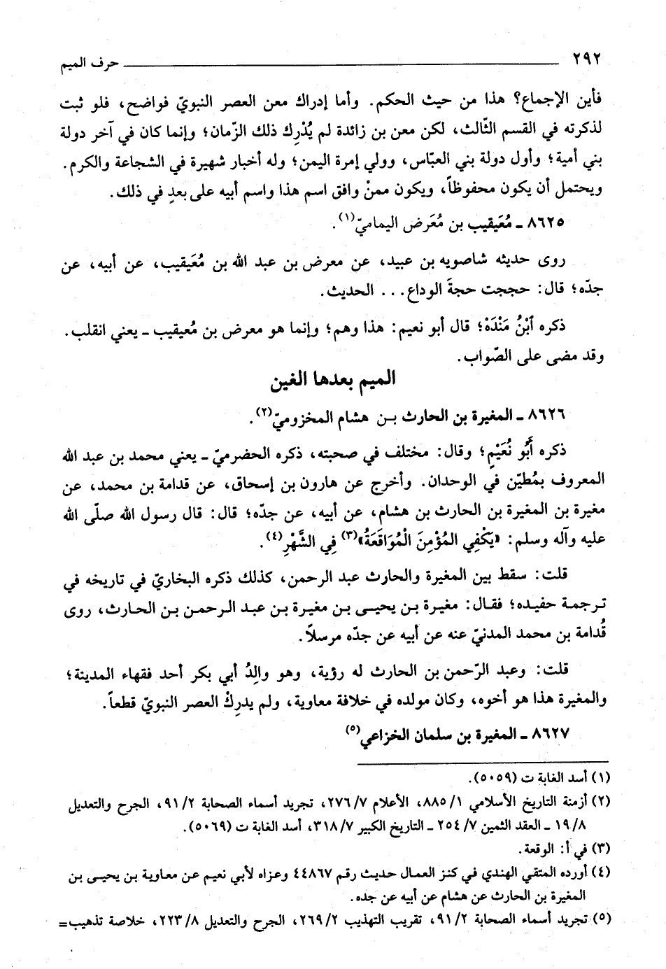 قلت: وعبد الرّحمن بن الحارث له رؤية، وهو والد أبي بكر أحد فقهاء المدينة، والمغيرة هذا هو أخوه، وكان مولده في خلافة معاوية، ولم يدرك العصر النبويّ قطعا.