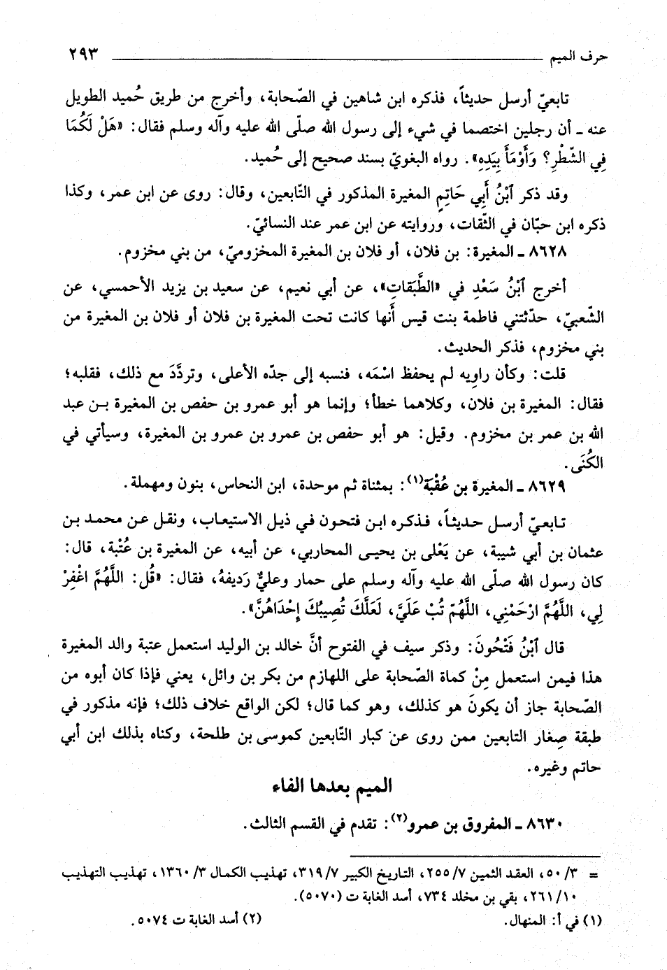 قلت: وكأن راويه لم يحفظ اسمه، فنسبه إلى جدّه الأعلى، وتردّد مع ذلك، فقلبه، فقال: المغيرة بن فلان، وكلاهما خطأ، وإنما هو أبو عمرو بن حفص بن المغيرة بن عبد اللَّه بن عمر بن مخزوم. وقيل: هو أبو حفص بن عمرو بن عمرو بن المغيرة، وسيأتي في الكنى.