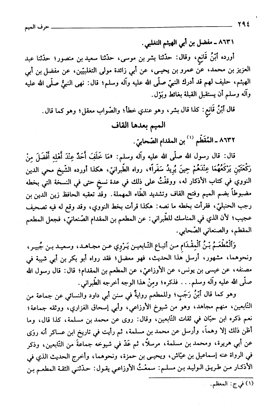 هكذا أورده الشّيخ محيي الدين النووي في كتاب الأذكار له، ووقفت على ذلك في عدة نسخ حتى في النسخة التي بخطه مضبوطا بضم الميم وفتح القاف وتشديد الطّاء المهملة. وقد تعقبه الحافظ زين الدين بن رجب الحنبليّ، فقرأت بخطه ما نصه: هكذا قرأت بخط النووي، وقد وقع له فيه تصحيف عجيب، لأن الّذي في المناسك للطّبراني: عن المطعم بن المقدام الصّنعانيّ، فجعل المطعم المقطم، والصنعاني الصّحابي.