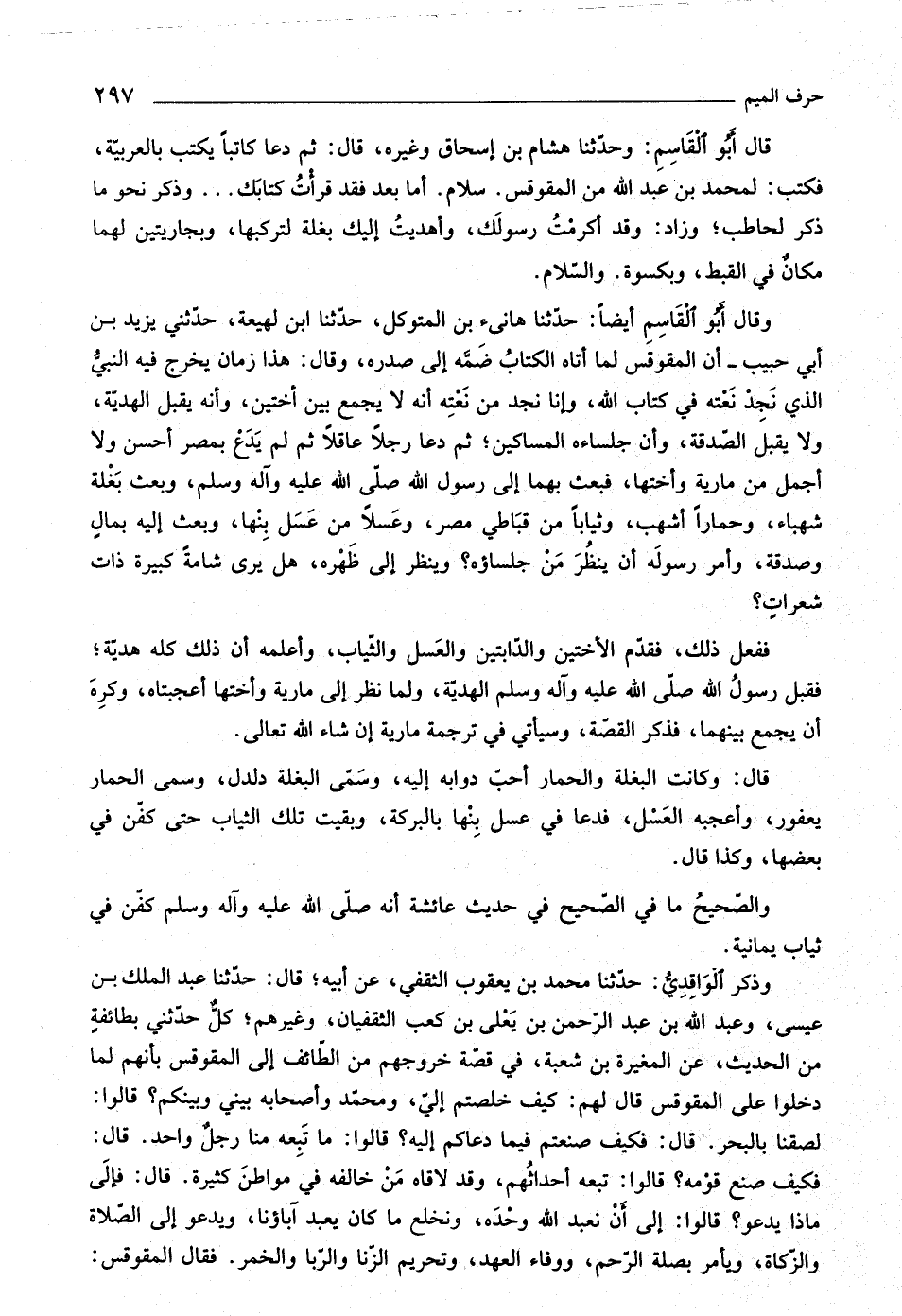 قال أبو القاسم: وحدّثنا هشام بن إسحاق وغيره، قال: ثم دعا كاتبا يكتب بالعربيّة، فكتب: لمحمد بن عبد اللَّه من المقوقس. سلام. أما بعد فقد قرأت كتابك ... وذكر نحو ما ذكر لحاطب، وزاد: وقد أكرمت رسولك، وأهديت إليك بغلة لتركبها، وبجاريتين لهما مكان في القبط، وبكسوة. والسّلام.