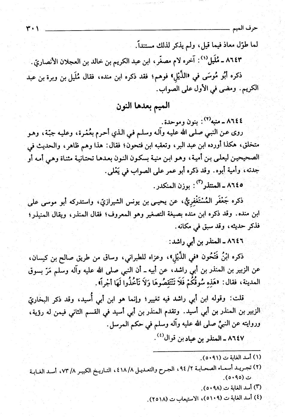 ذكره جعفر المستغفريّ، عن يحيى بن يونس الشيرازيّ، واستدركه أبو موسى على ابن مندة. وقد ذكره ابن مندة بصيغة التصغير وهو المعروف، فقال المنذر، ويقال المنيذر، فذكر حديثه، وقد سبق في مكانه.