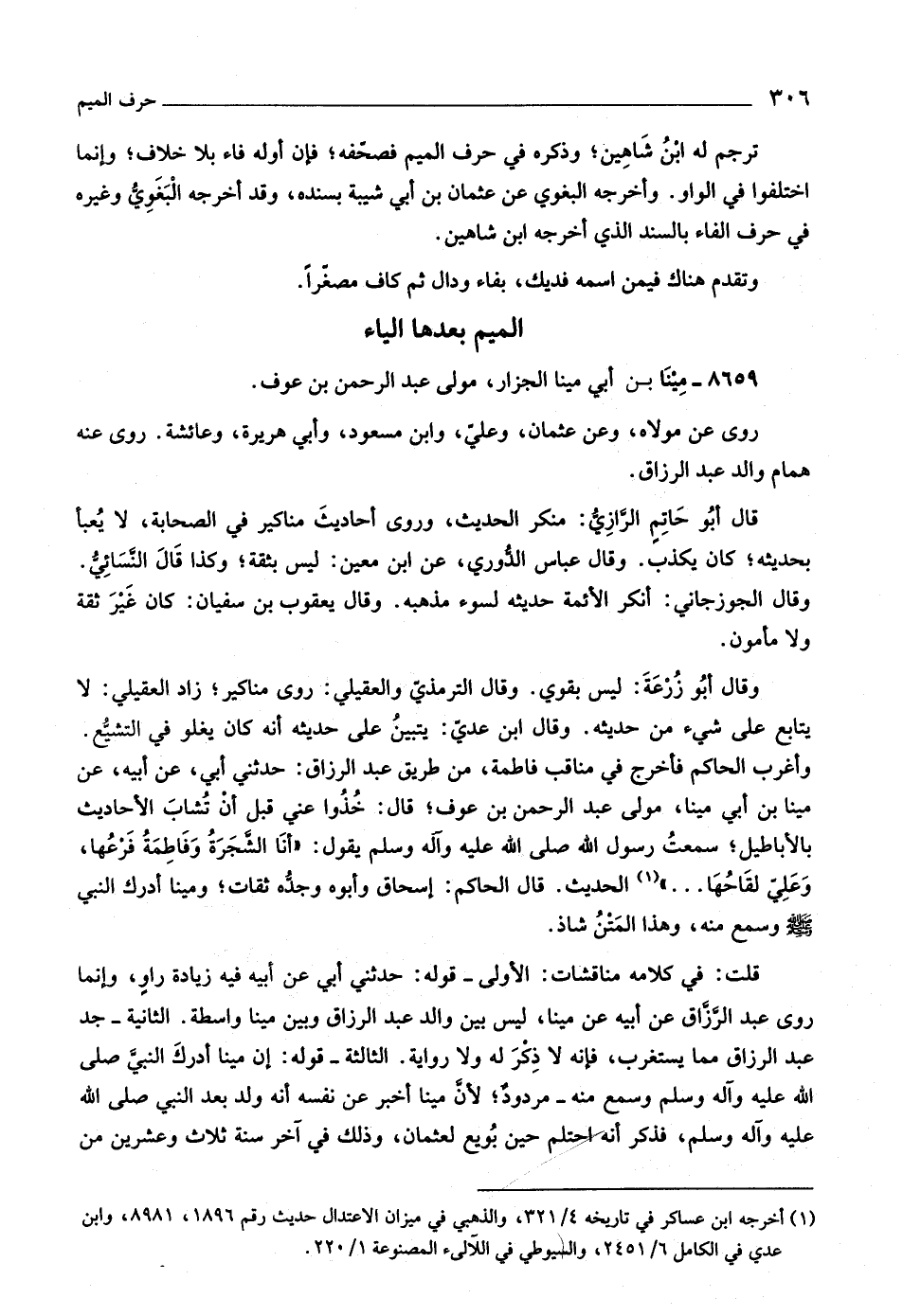 قلت: في كلامه مناقشات: الأولى- قوله: حدثني أبي عن أبيه فيه زيادة راو، وإنما روى عبد الرّزّاق عن أبيه عن مينا، ليس بين والد عبد الرزاق وبين مينا واسطة. الثانية- جد عبد الرزاق مما يستغرب، فإنه لا ذكر له ولا رواية. الثالثة- قوله: إن مينا أدرك النبيّ صلى اللَّه عليه وآله وسلم وسمع منه- مردود، لأنّ مينا أخبر عن نفسه أنه ولد بعد النبي صلى اللَّه عليه وآله وسلم، فذكر أنه احتلم حين بويع لعثمان، وذلك في آخر سنة ثلاث وعشرين من