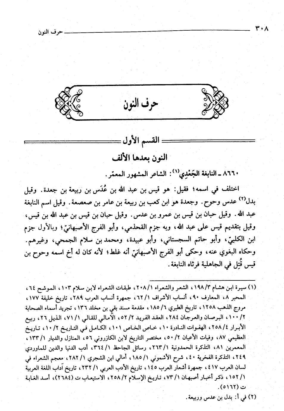 اختلف في اسمه، فقيل: هو قيس بن عبد اللَّه بن عدس بن ربيعة بن جعدة. وقيل بدل «٢» عدس وحوح. وجعدة هو ابن كعب بن ربيعة بن عامر بن صعصعة. وقيل اسم النابغة عبد اللَّه. وقيل حبان بن قيس بن عمرو بن عدس. وقيل حبان بن قيس بن عبد اللَّه بن قيس، وقيل بتقديم قيس على عبد اللَّه، وبه جزم القحذمي، وأبو الفرج الأصبهانيّ، وبالأول جزم ابن الكلبيّ، وأبو حاتم السجستاني، وأبو عبيدة، ومحمد بن سلام الجمحيّ، وغيرهم.